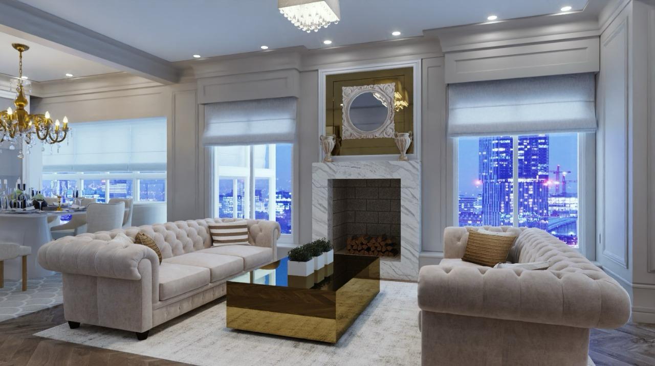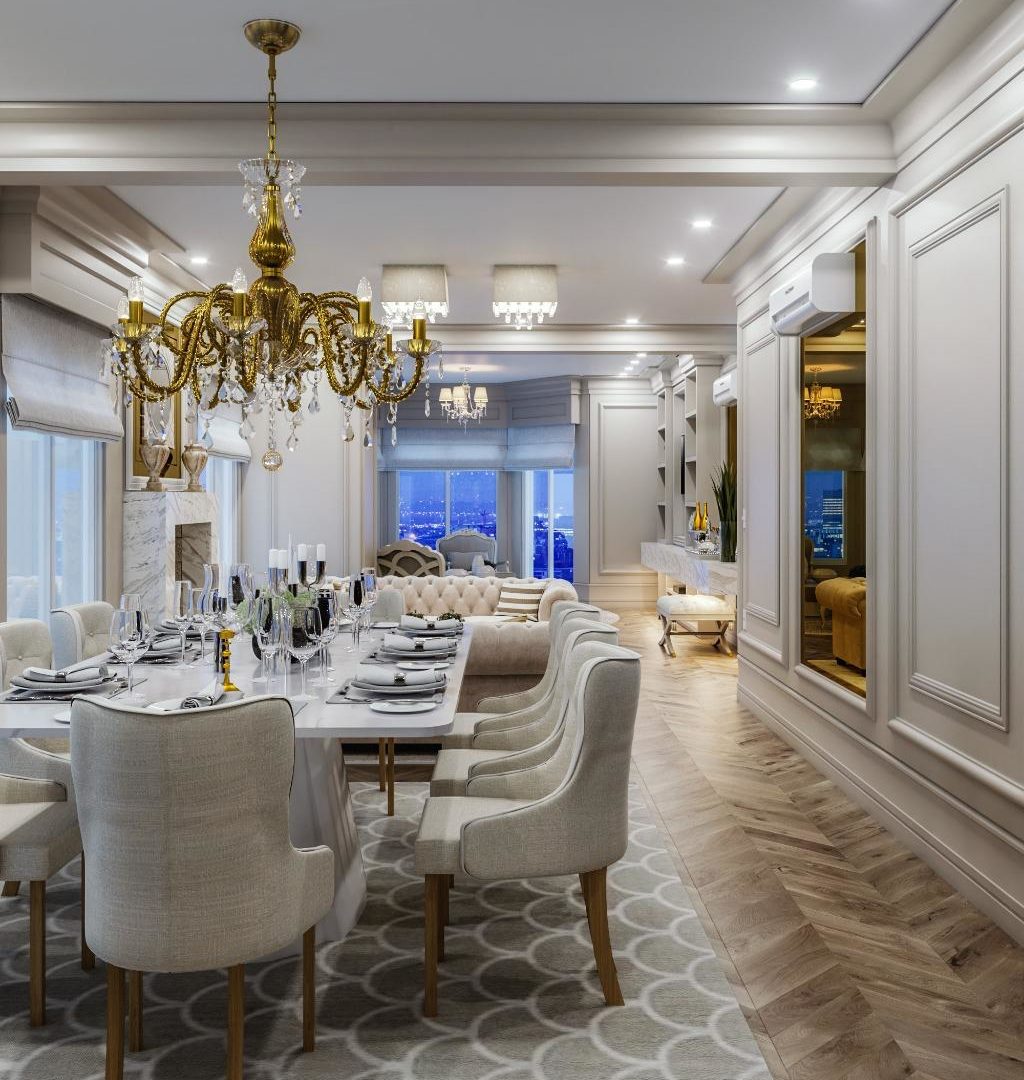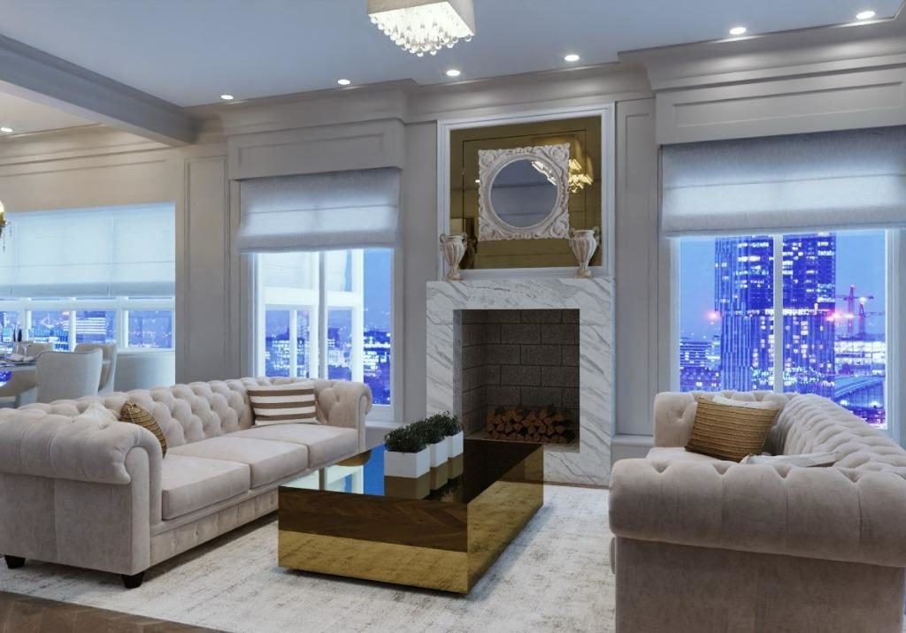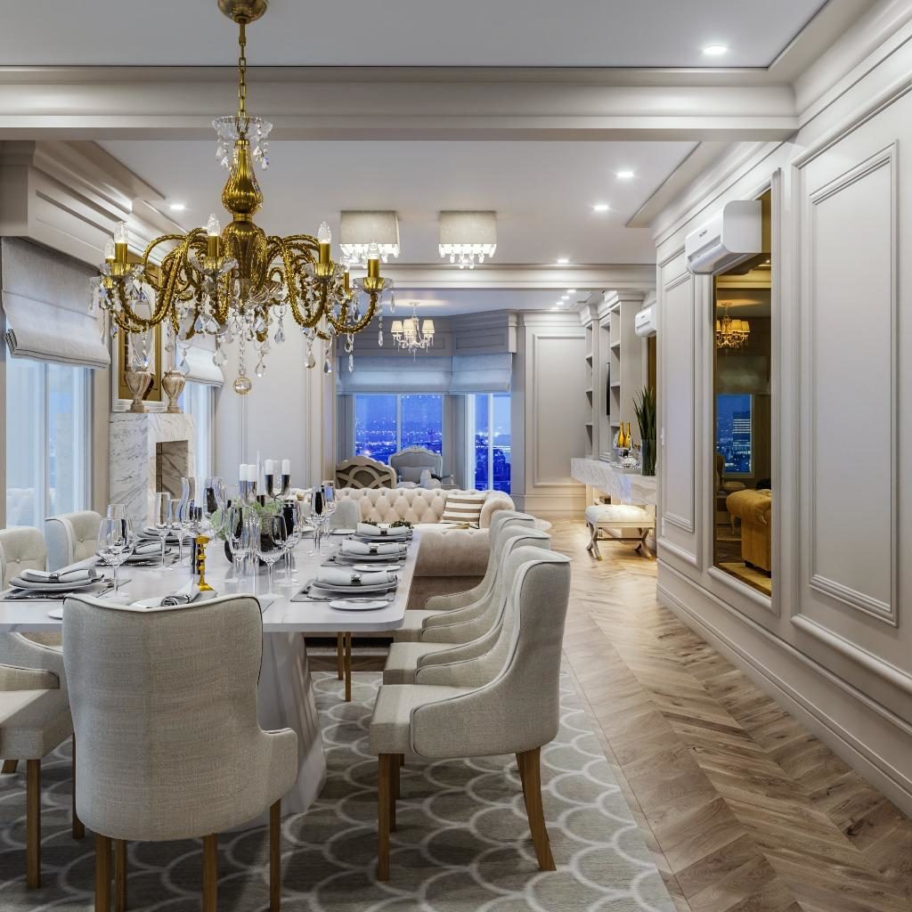 Living acolhedor com lareira e estante iluminada, que combina tons de azul e madeira natural. Um espaço elegante e convidativo, com atmosfera contemporânea e toques de aconchego. Ambiente clássico e sofisticado, com sala de jantar e estar integradas. A paleta neutra, o dourado dos lustres e o mármore na lareira criam uma atmosfera elegante e atemporal, marcada por conforto e refinamento.