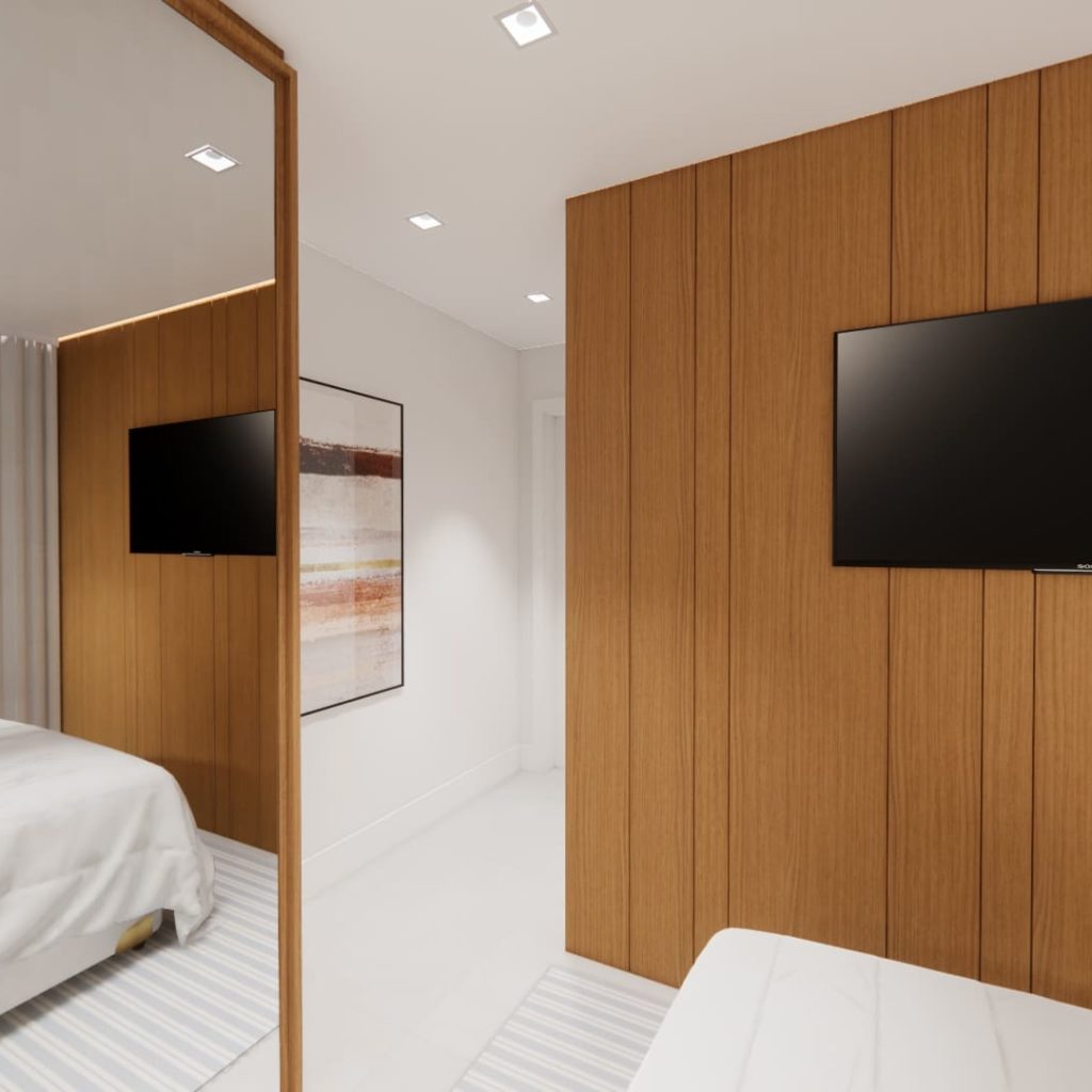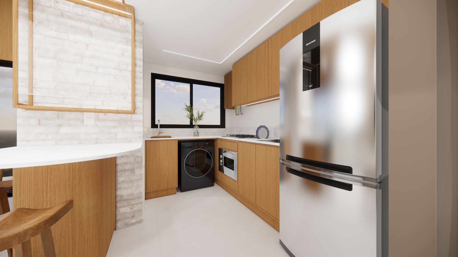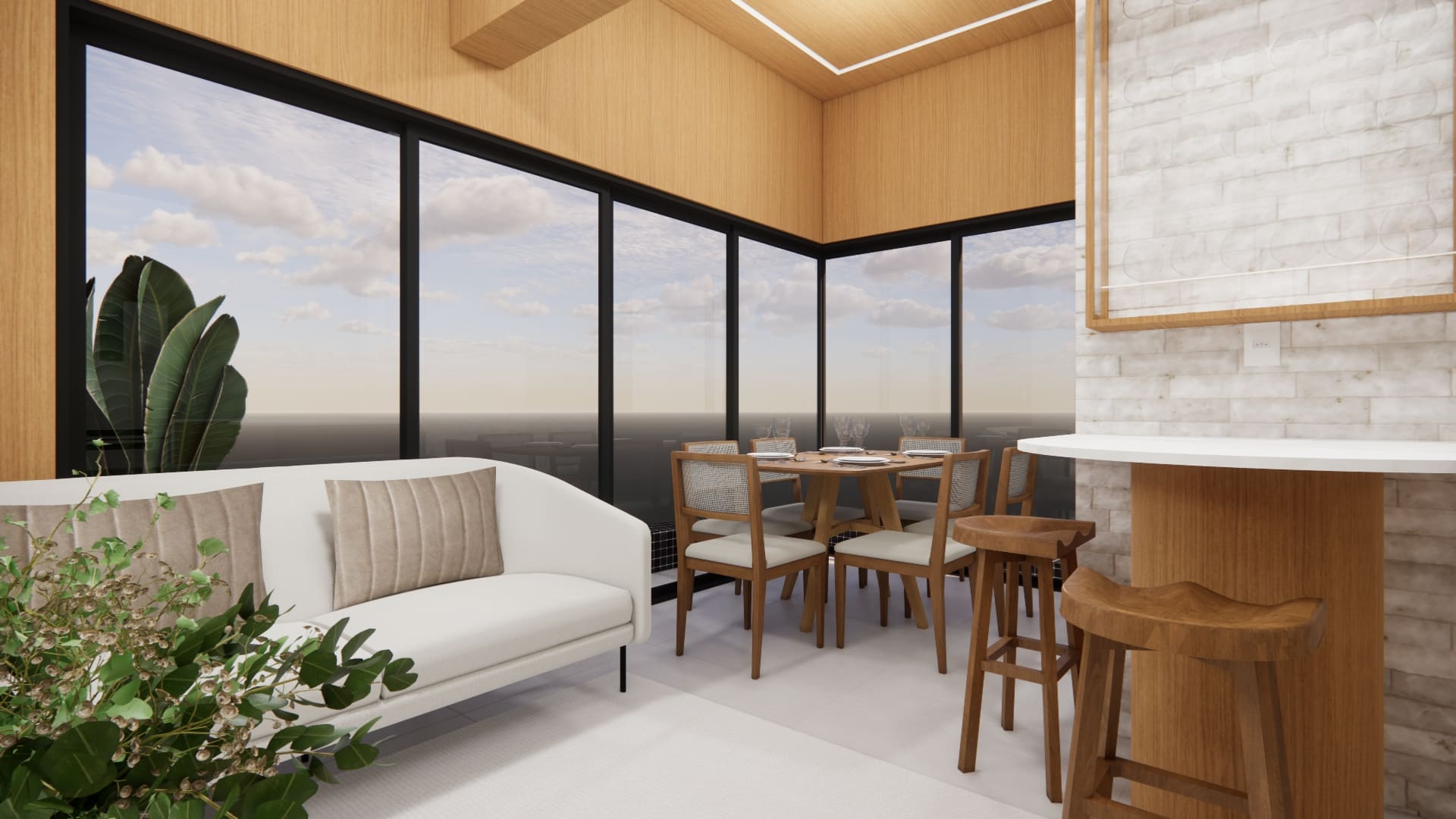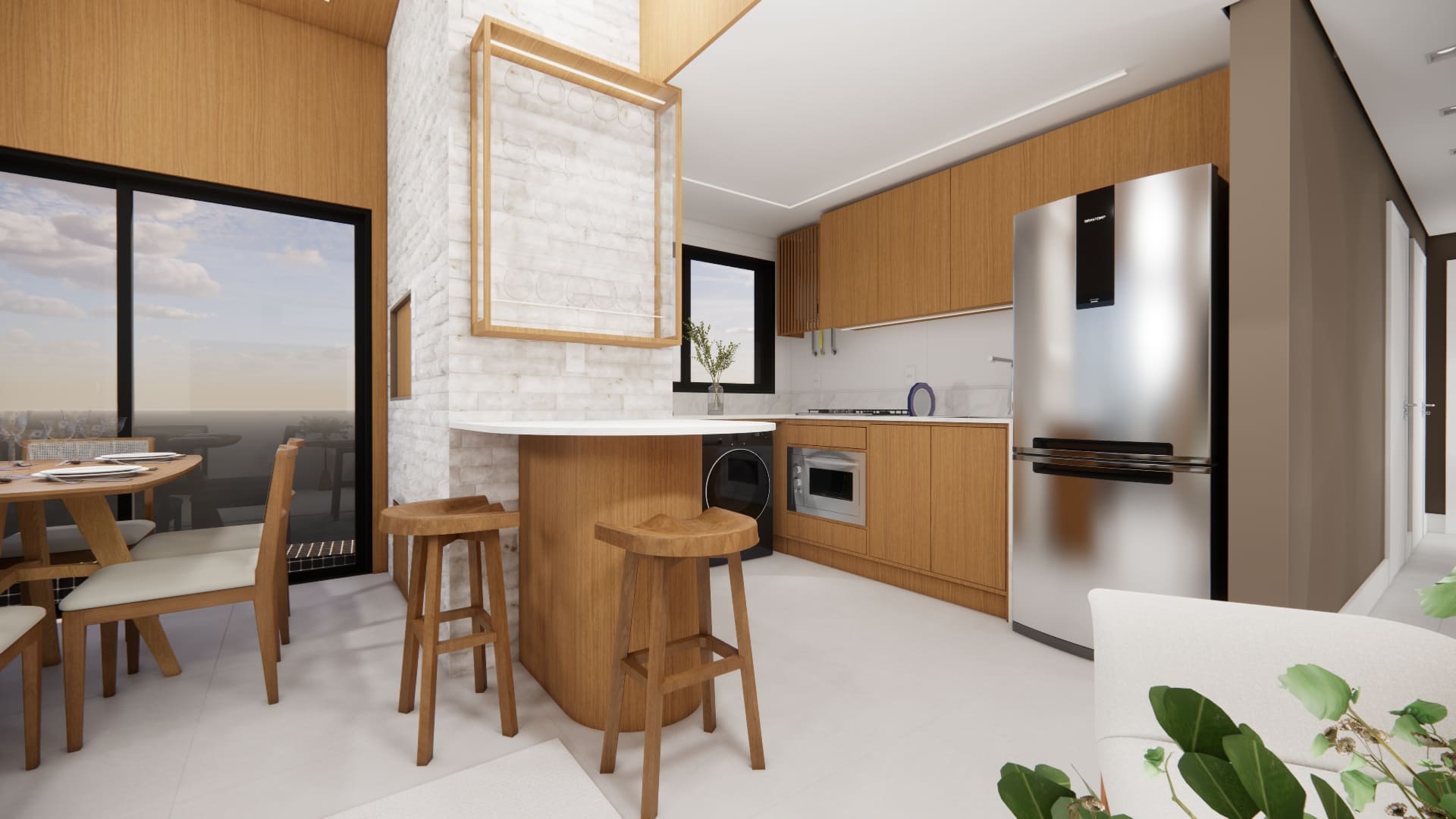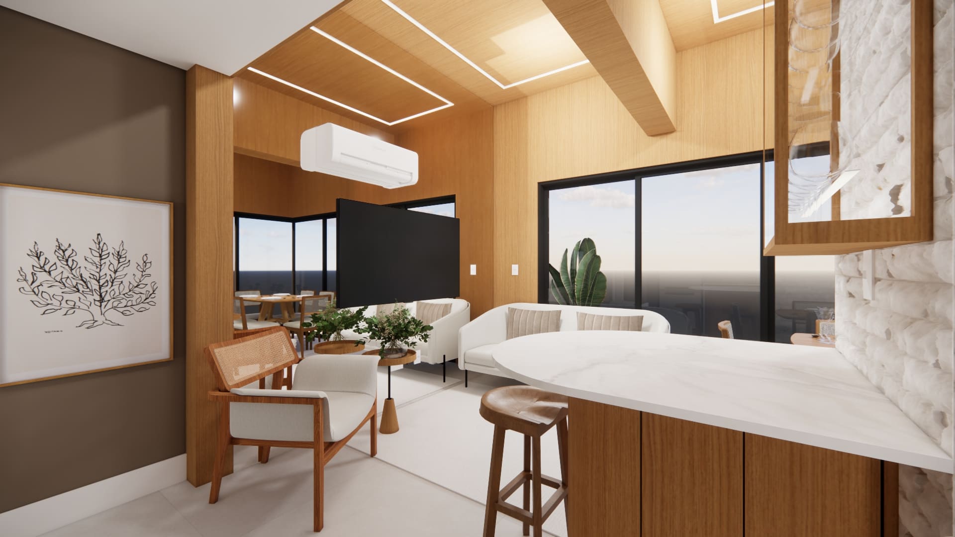 Apartamento contemporâneo com integração entre estar, jantar e cozinha, valorizado por painéis amadeirados, iluminação embutida e grandes aberturas envidraçadas que ampliam a luz natural e a vista.