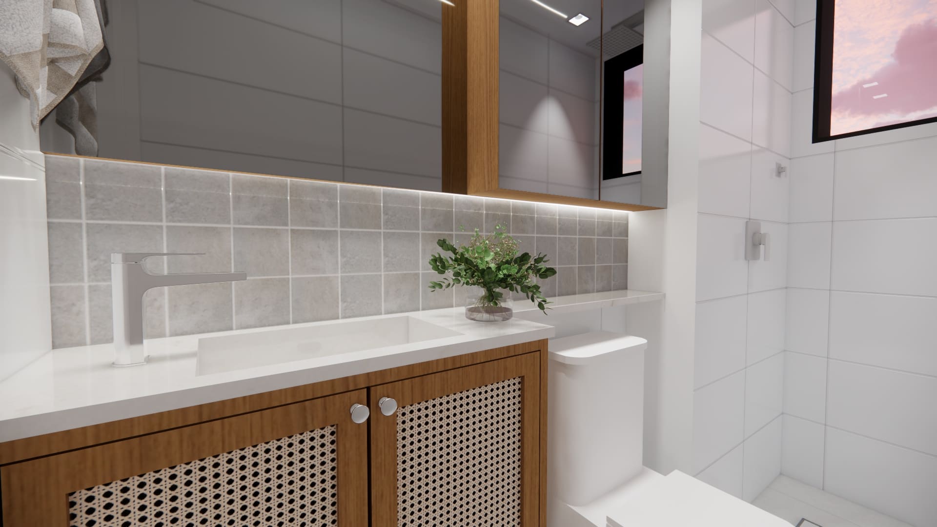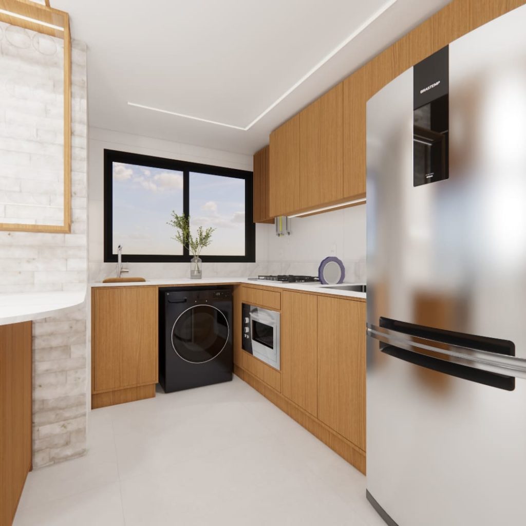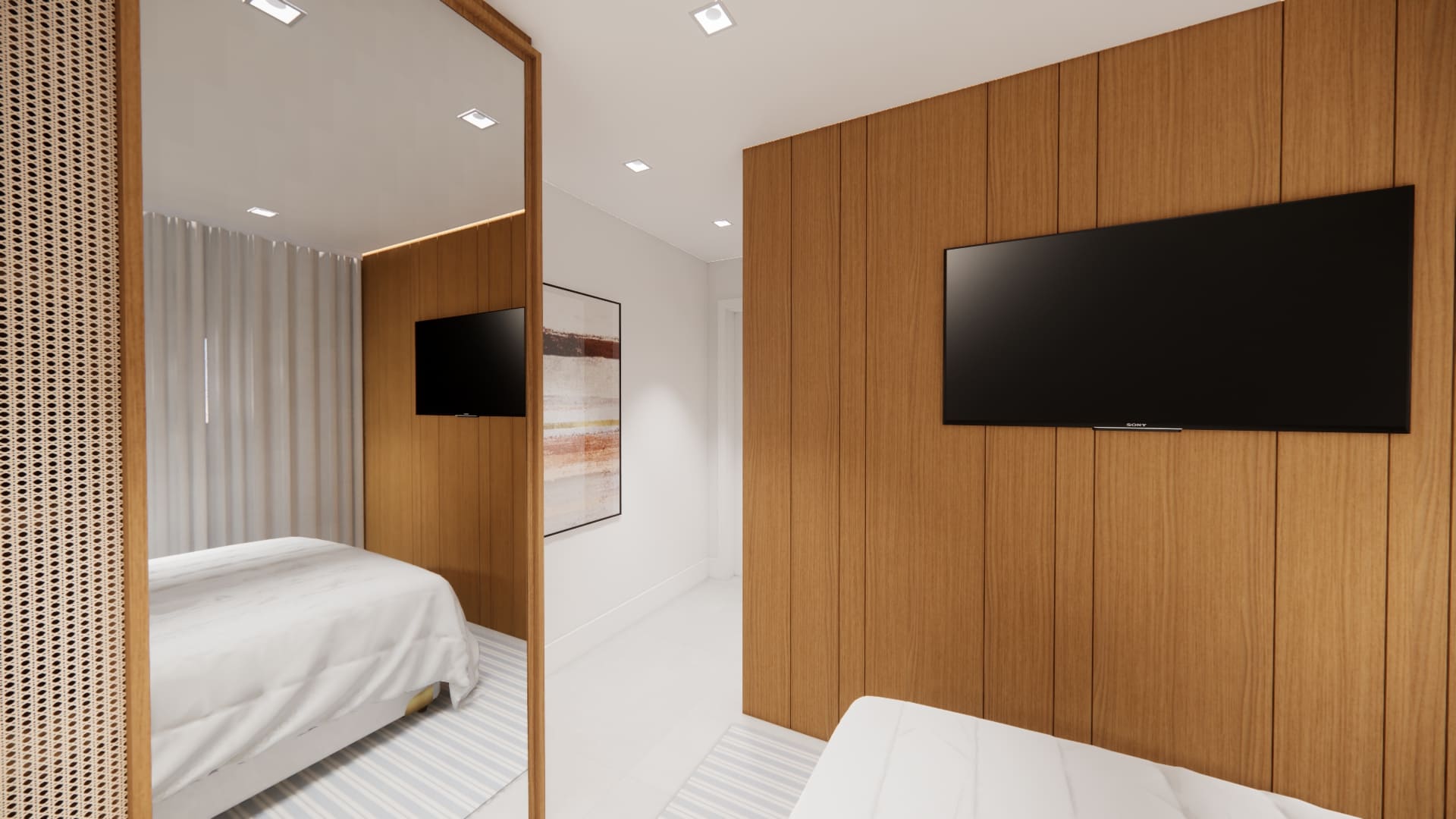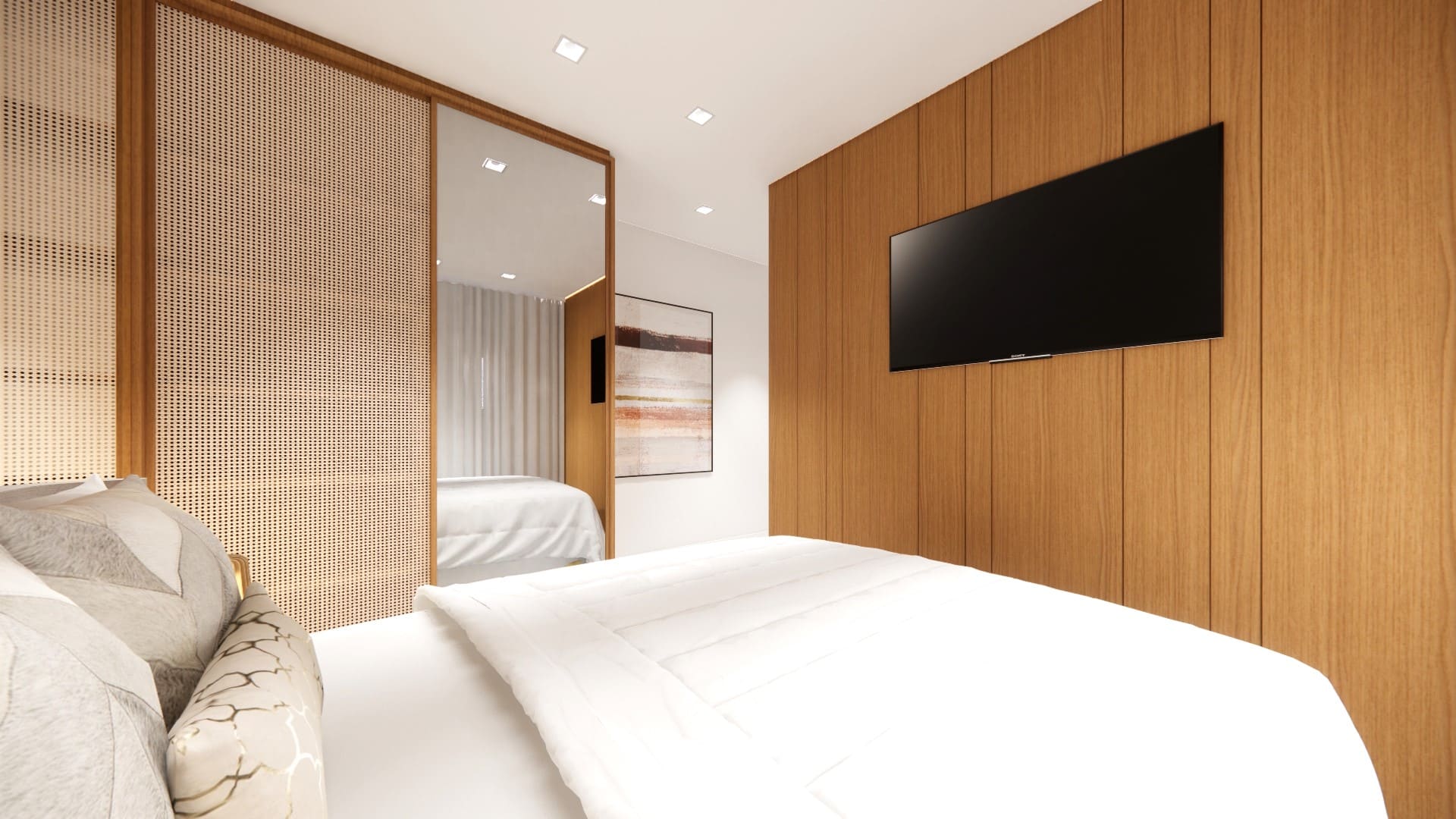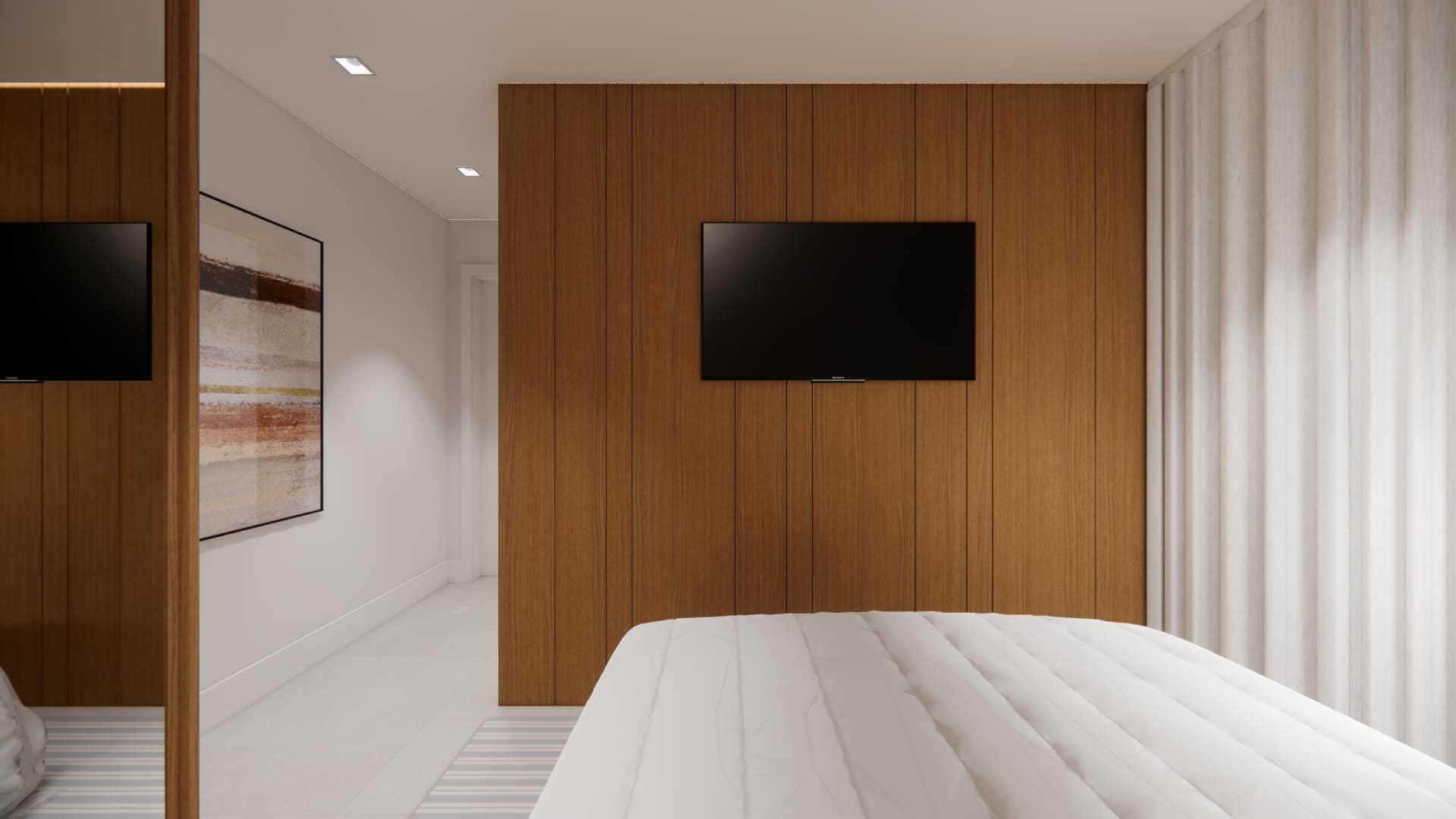 Apartamento contemporâneo com integração entre estar, jantar e cozinha, valorizado por painéis amadeirados, iluminação embutida e grandes aberturas envidraçadas que ampliam a luz natural e a vista.