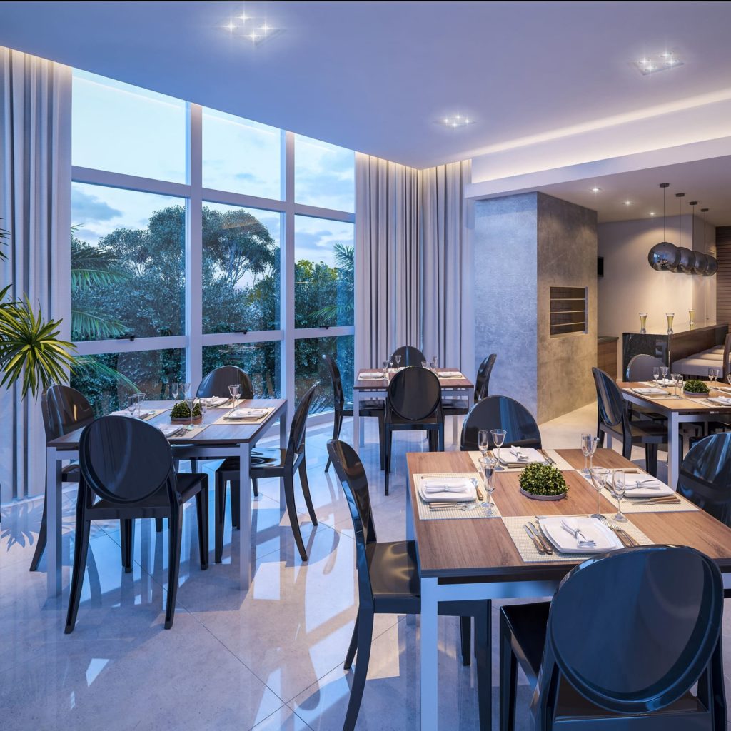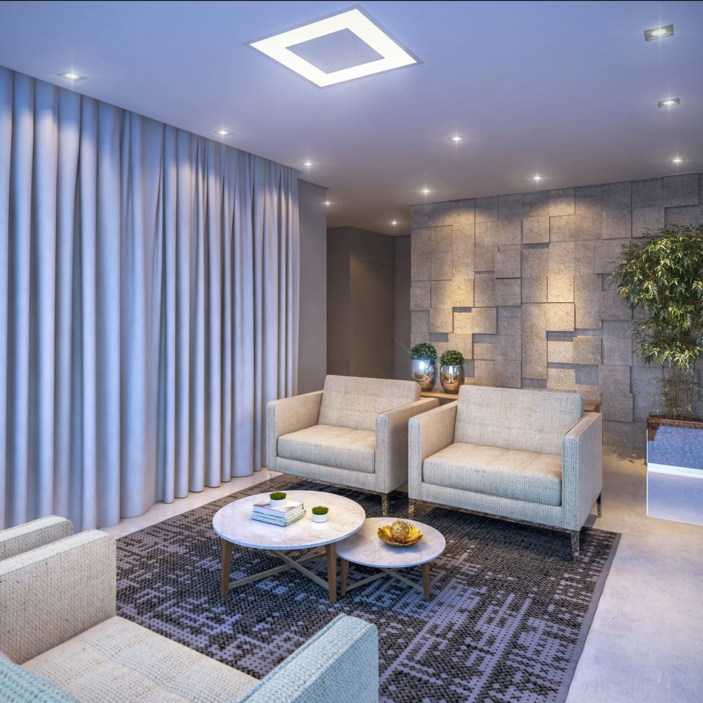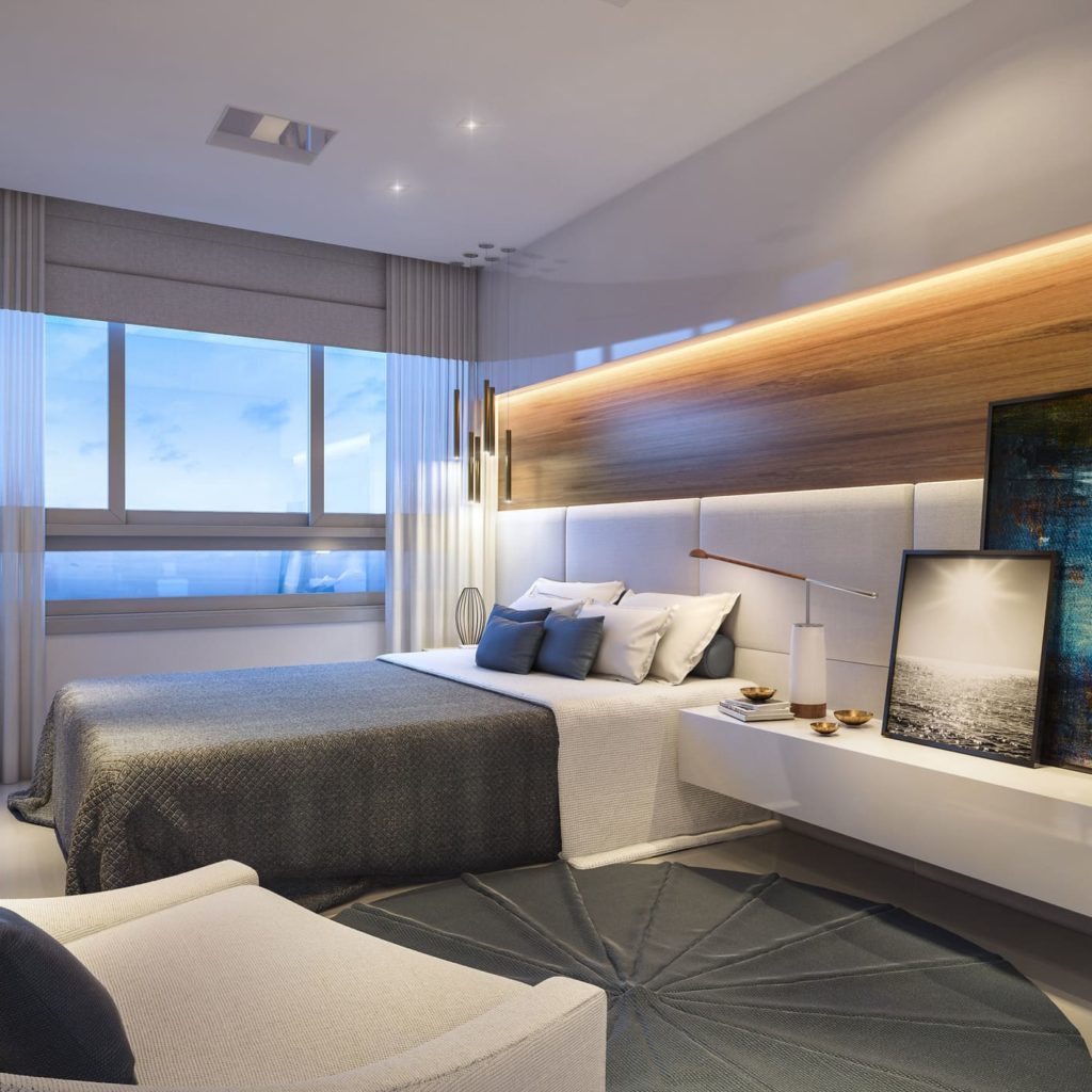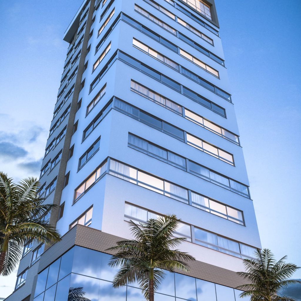 Edifício residencial contemporâneo de linhas verticais elegantes e fachada envidraçada que reflete o entorno urbano. A combinação de vidro espelhado e volumes brancos cria leveza e sofisticação, destacando a imponência da torre e sua integração com o paisagismo tropical da base.