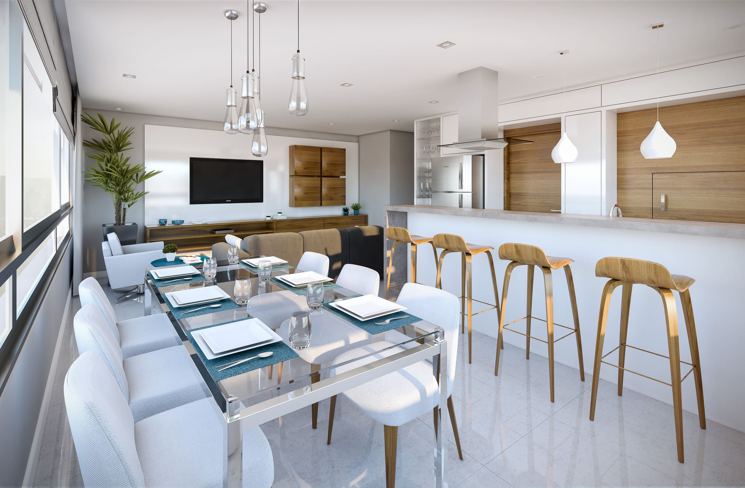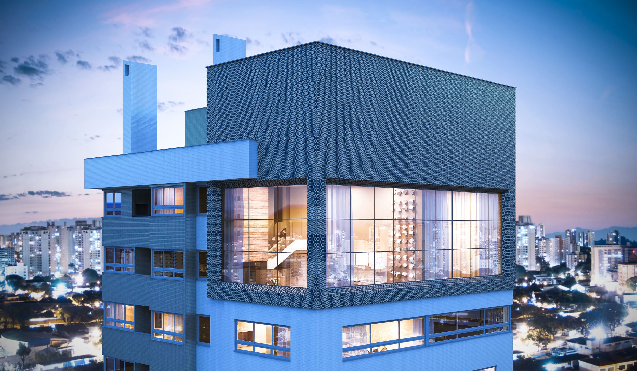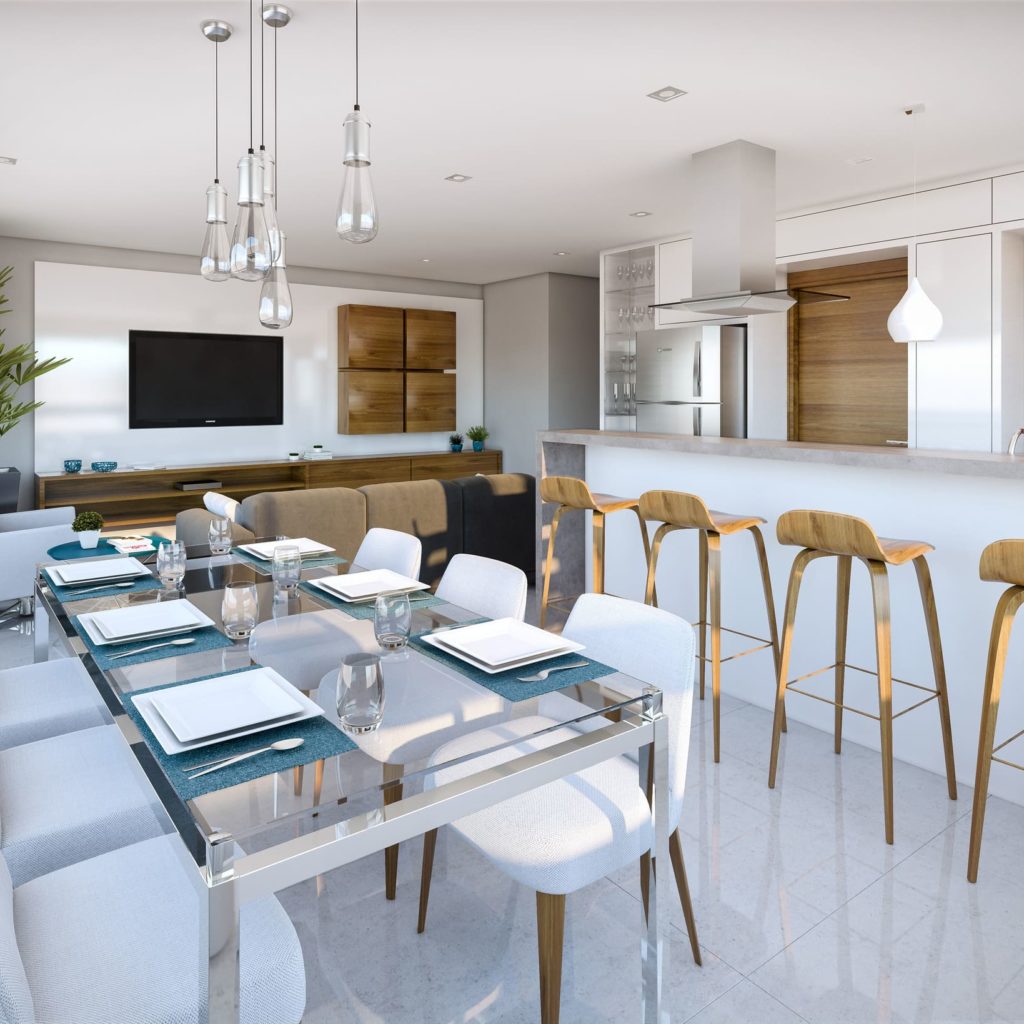 Edifício residencial contemporâneo de linhas verticais elegantes e fachada envidraçada que reflete o entorno urbano. A combinação de vidro espelhado e volumes brancos cria leveza e sofisticação, destacando a imponência da torre e sua integração com o paisagismo tropical da base.