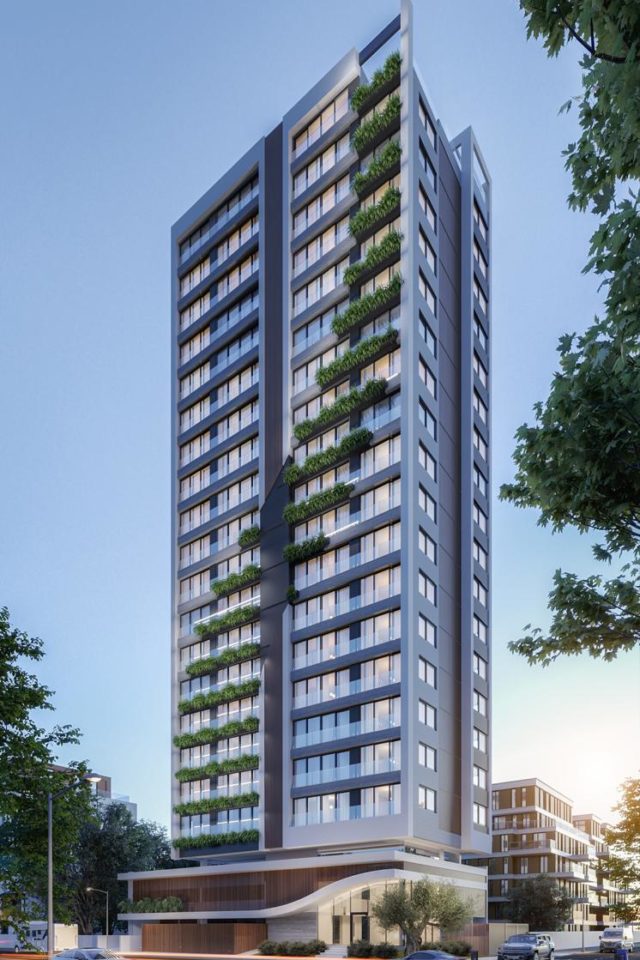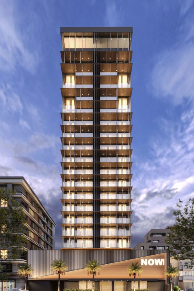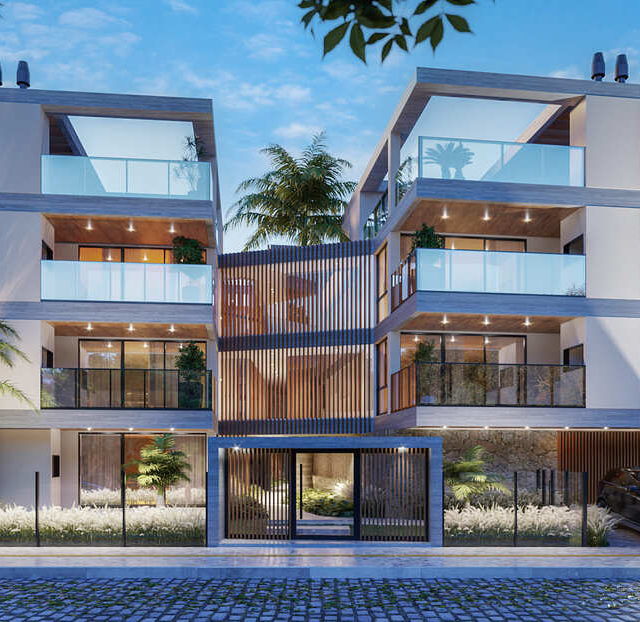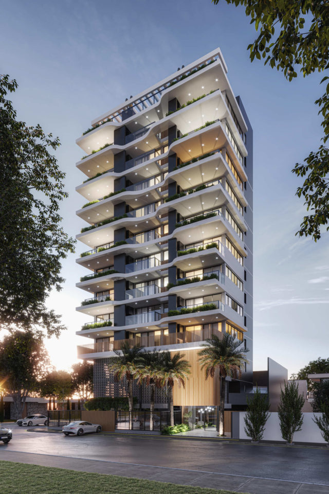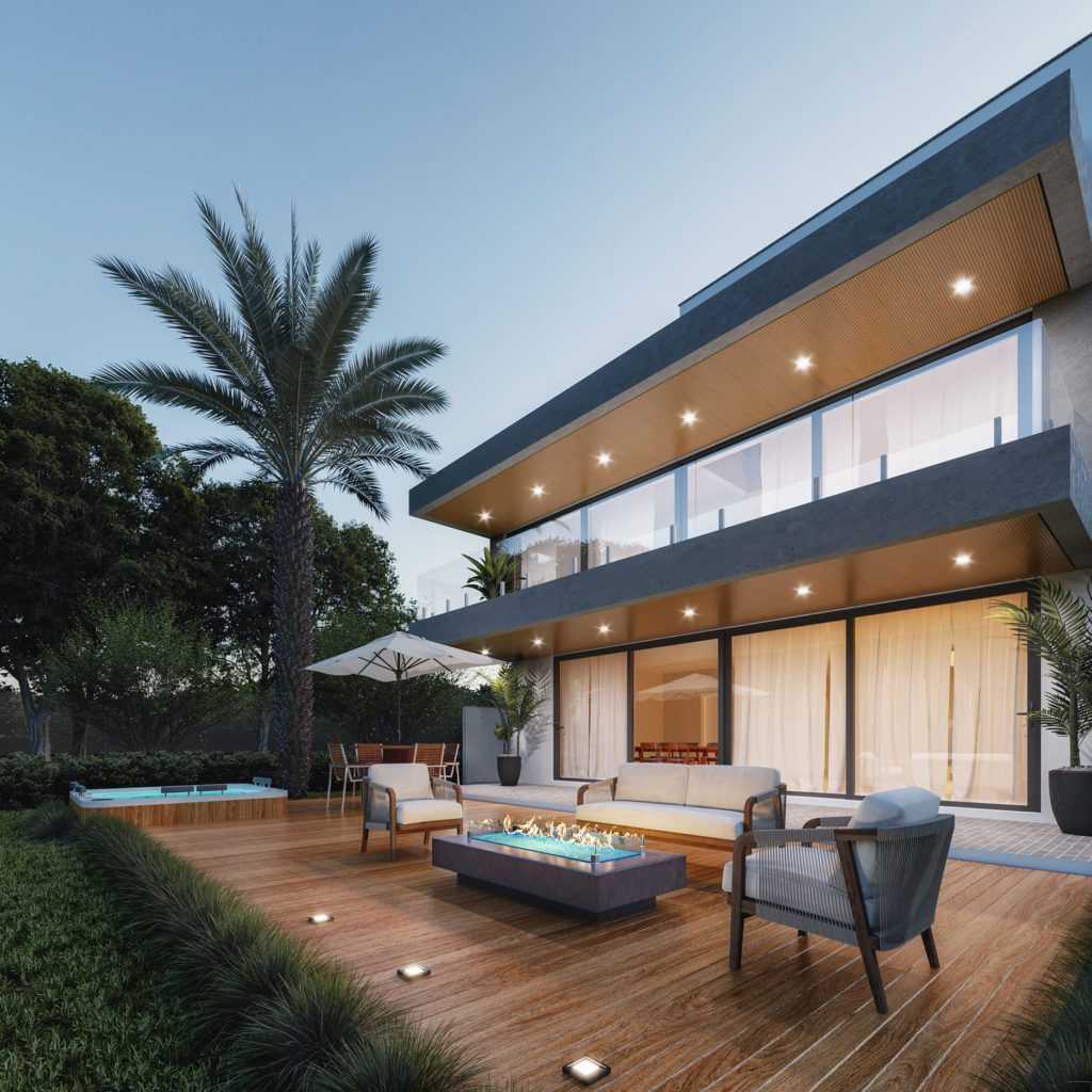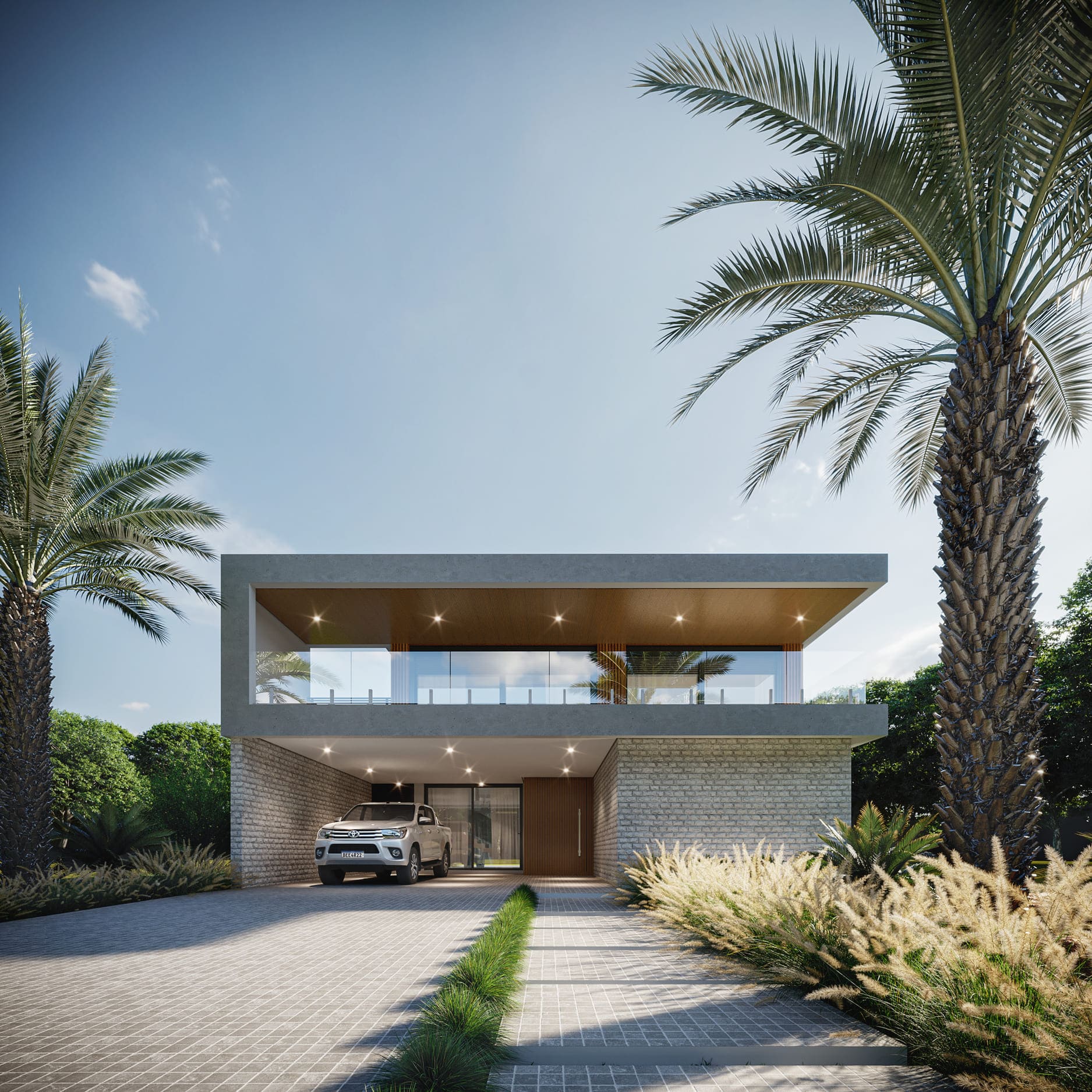 Residência moderna de linhas horizontais marcantes, com volumetria leve e integração entre pedra natural e concreto. O balanço superior abriga terraço com vista, enquanto o paisagismo tropical complementa a elegância e o estilo contemporâneo da fachada.