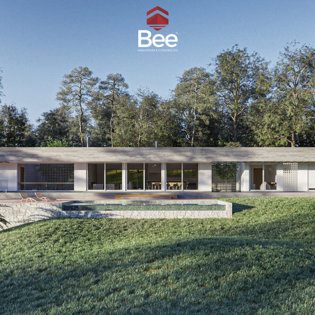 A piscina frontal reforça o eixo visual da arquitetura e cria uma conexão direta entre casa, paisagem e lazer. Um refúgio contemporâneo que une conforto, simplicidade e contemplação.