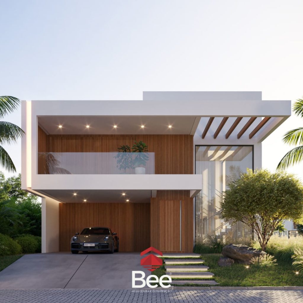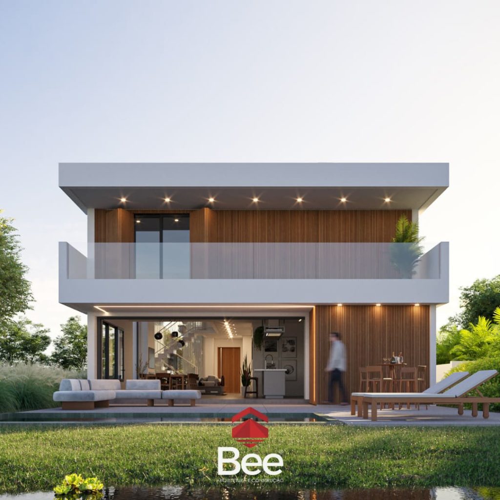 Residência contemporânea de dois pavimentos com volumes puros, linhas retas e fachada marcada por madeira ripada e grandes esquadrias. O projeto valoriza a iluminação natural, a ventilação e a integração com a área externa. Com estética leve e atemporal, a Casa Essência une elegância, funcionalidade e acolhimento em cada detalhe.