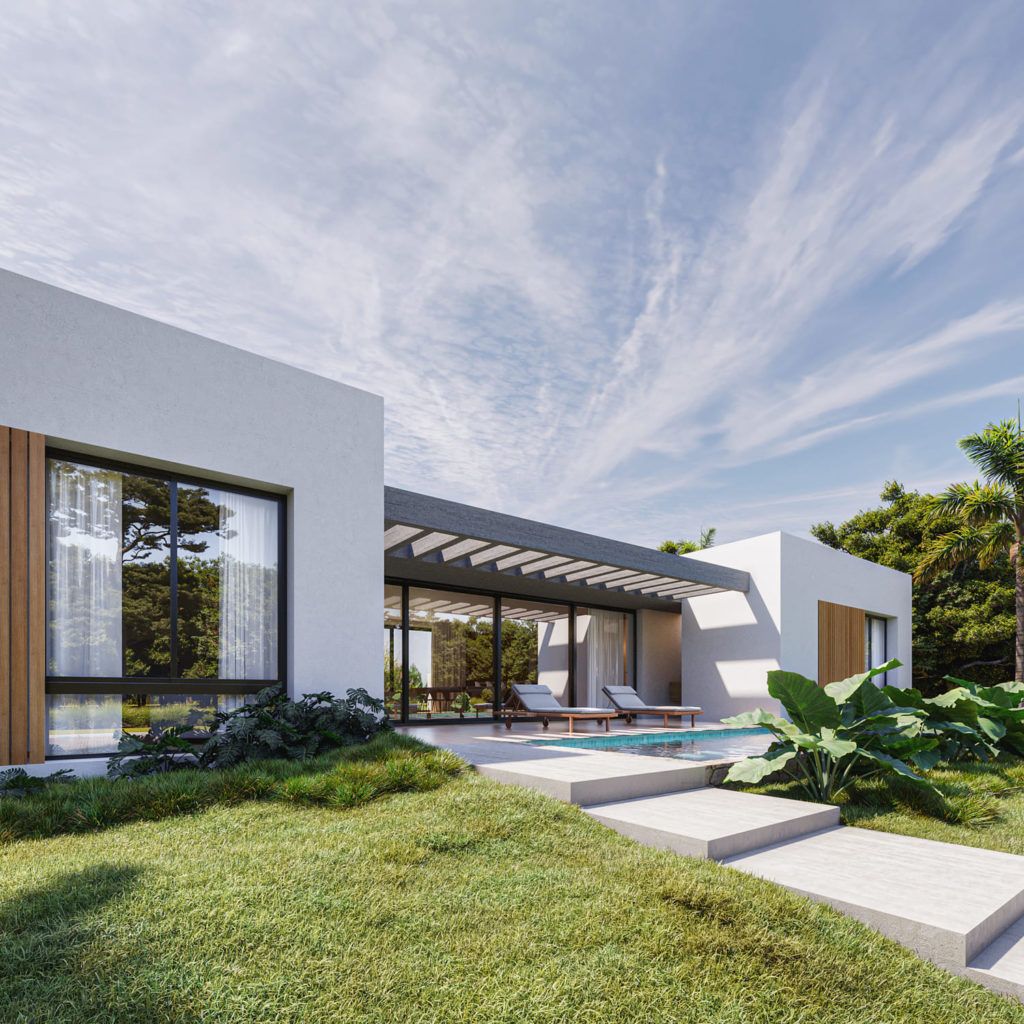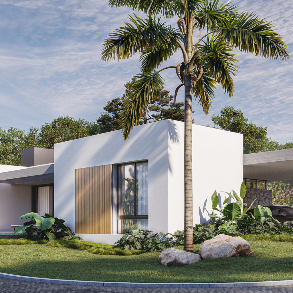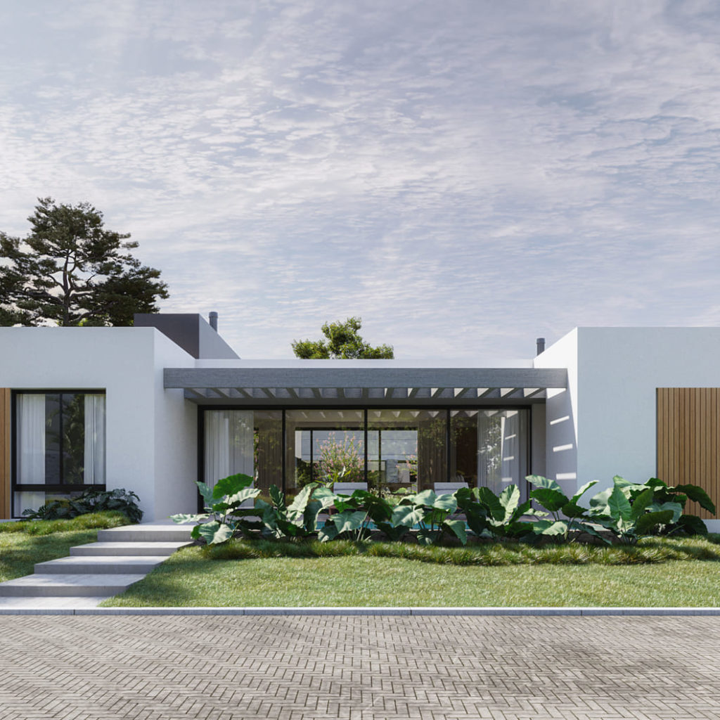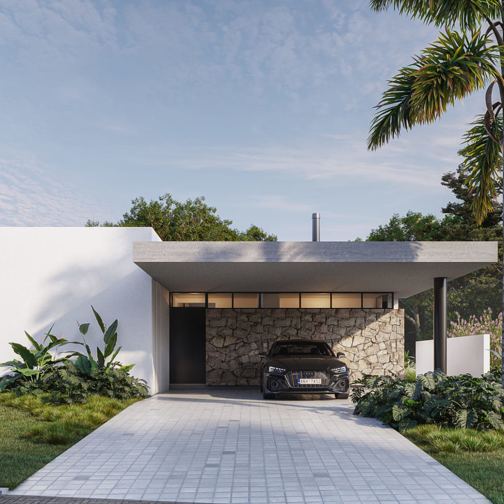 Residência térrea contemporânea com pé-direito elevado e volumes marcantes em concreto aparente. O projeto valoriza a horizontalidade, a integração com a natureza e o uso de materiais naturais como madeira, pedra e vegetação vertical. A arquitetura combina leveza e imponência, com grandes esquadrias, iluminação cênica e ambientes amplos e arejados. A Casa Horizonte traduz sofisticação, funcionalidade e conexão com o entorno em uma proposta atemporal e acolhedora.