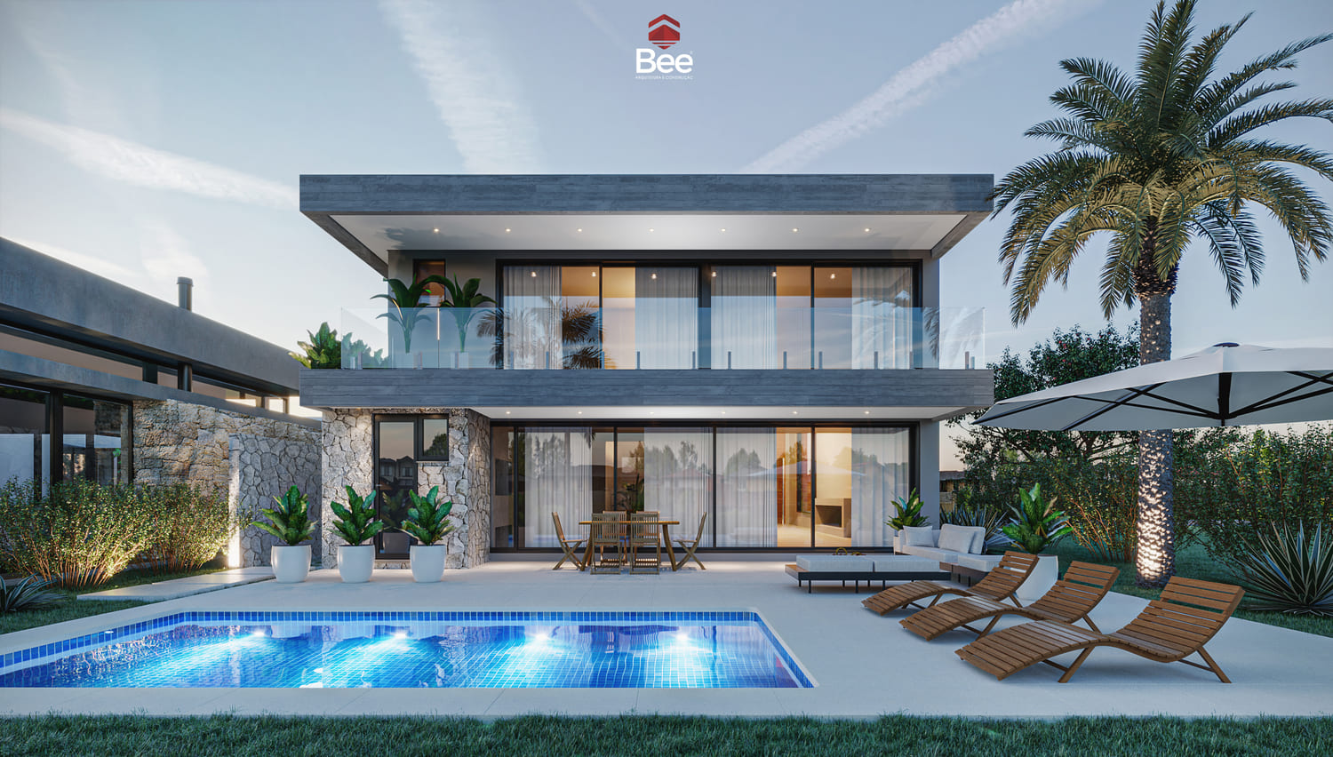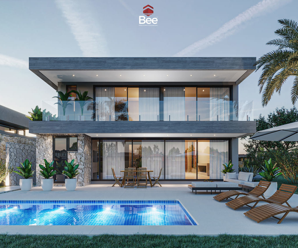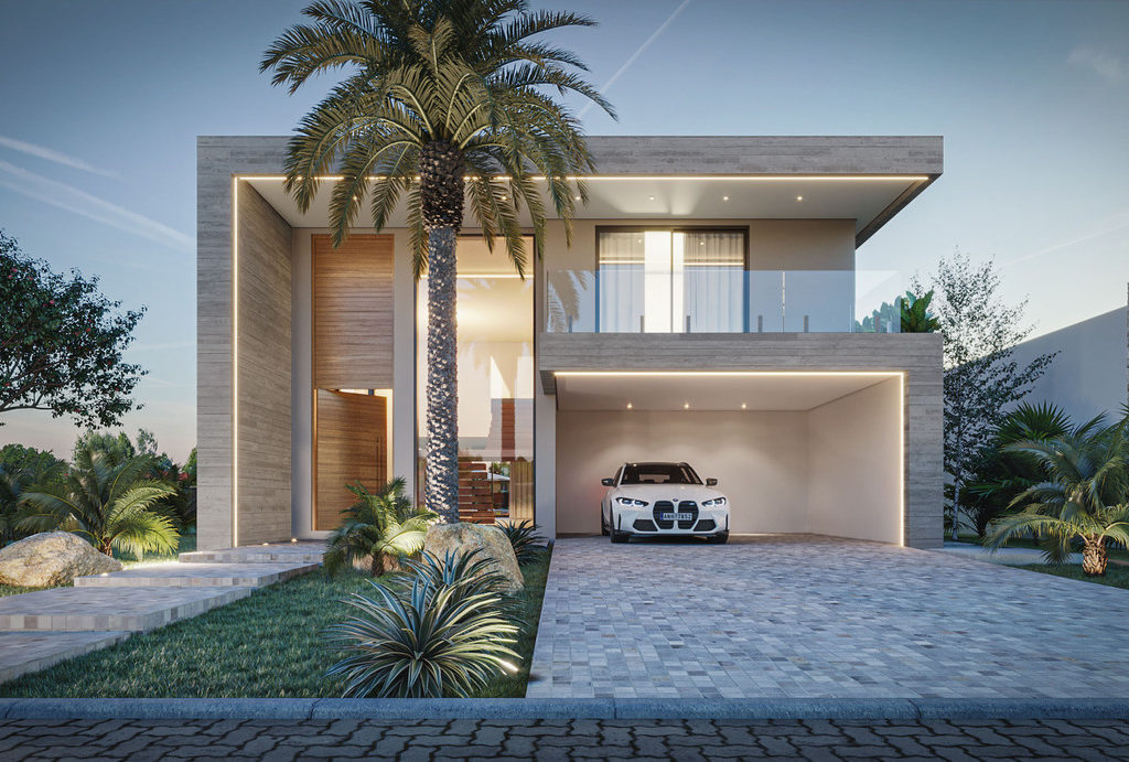 Residência contemporânea com volumetria elegante e fachada em tons neutros. O uso de pedra natural, madeira e iluminação embutida valoriza o design minimalista, enquanto a palmeira central e o paisagismo tropical complementam a composição sofisticada e acolhedora.