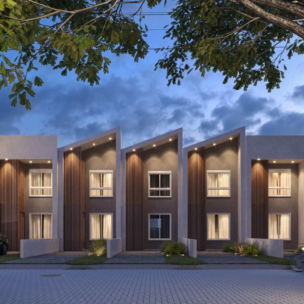 Conjunto residencial multifamiliar de linhas retas e volumetria simétrica, com destaque para o uso de madeira e iluminação cênica que valoriza a fachada e reforça o caráter contemporâneo do projeto.