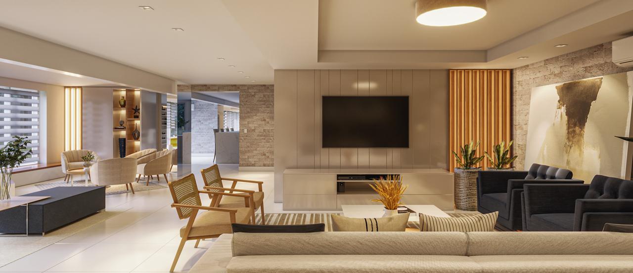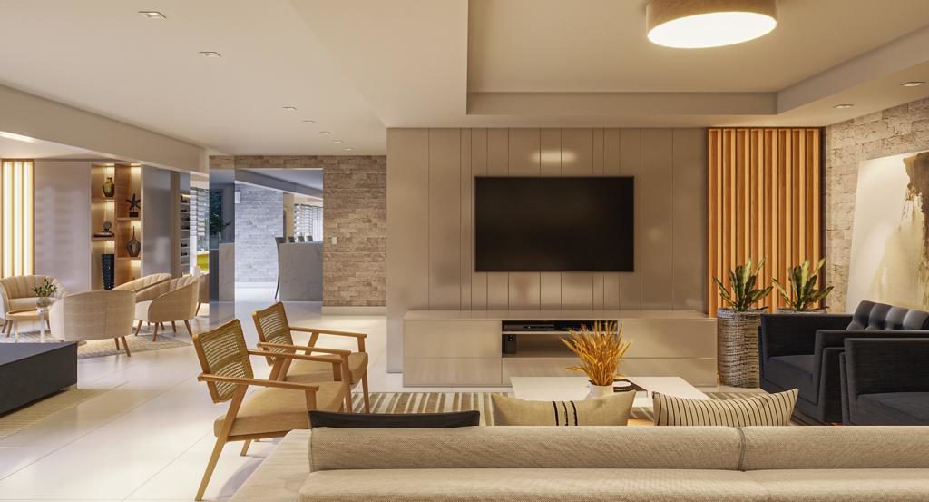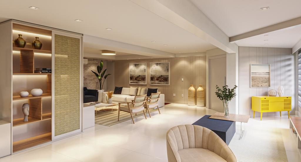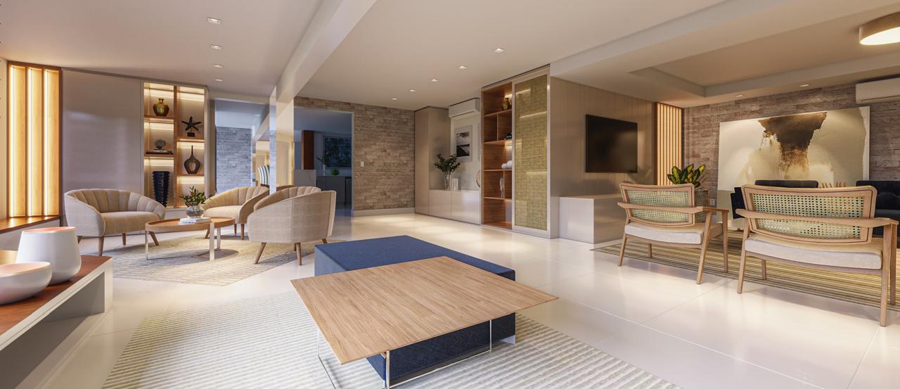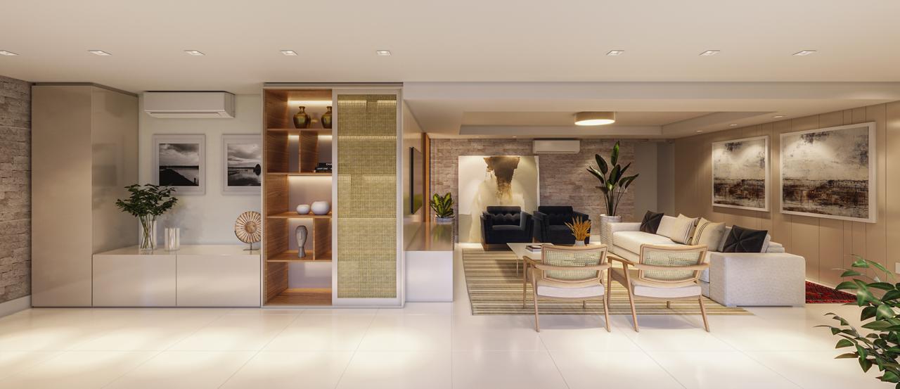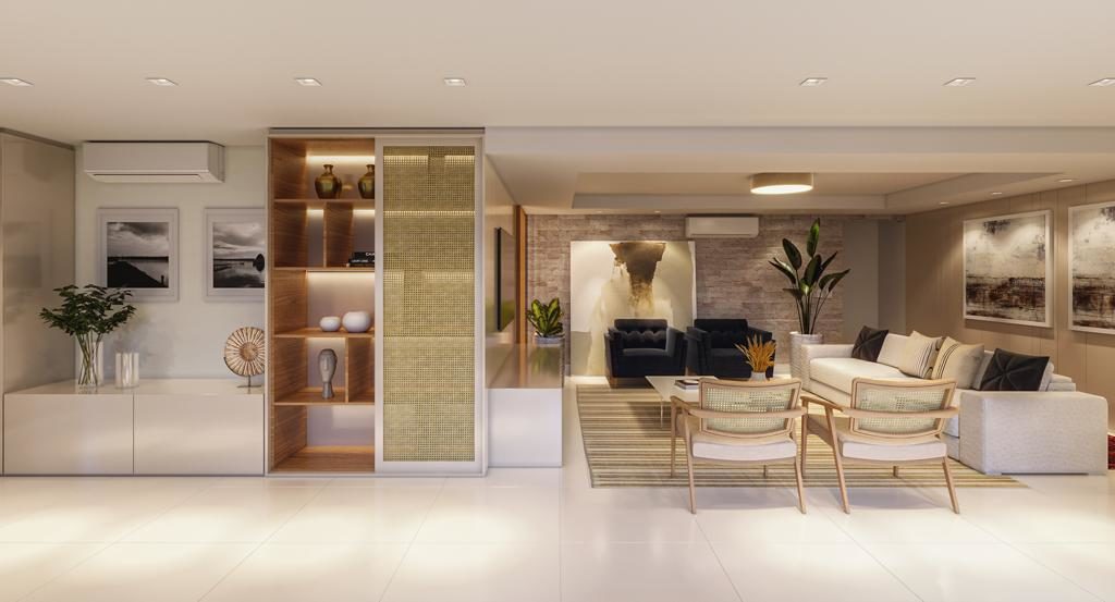 Este living foi projetado para valorizar a convivência e o conforto, com uma atmosfera acolhedora e elegante. A composição une texturas naturais, iluminação suave e mobiliário contemporâneo em tons neutros e amadeirados, criando um ambiente que transmite bem-estar e sofisticação. Os painéis iluminados e o destaque para obras de arte e elementos decorativos completam o cenário, ideal para receber e relaxar.