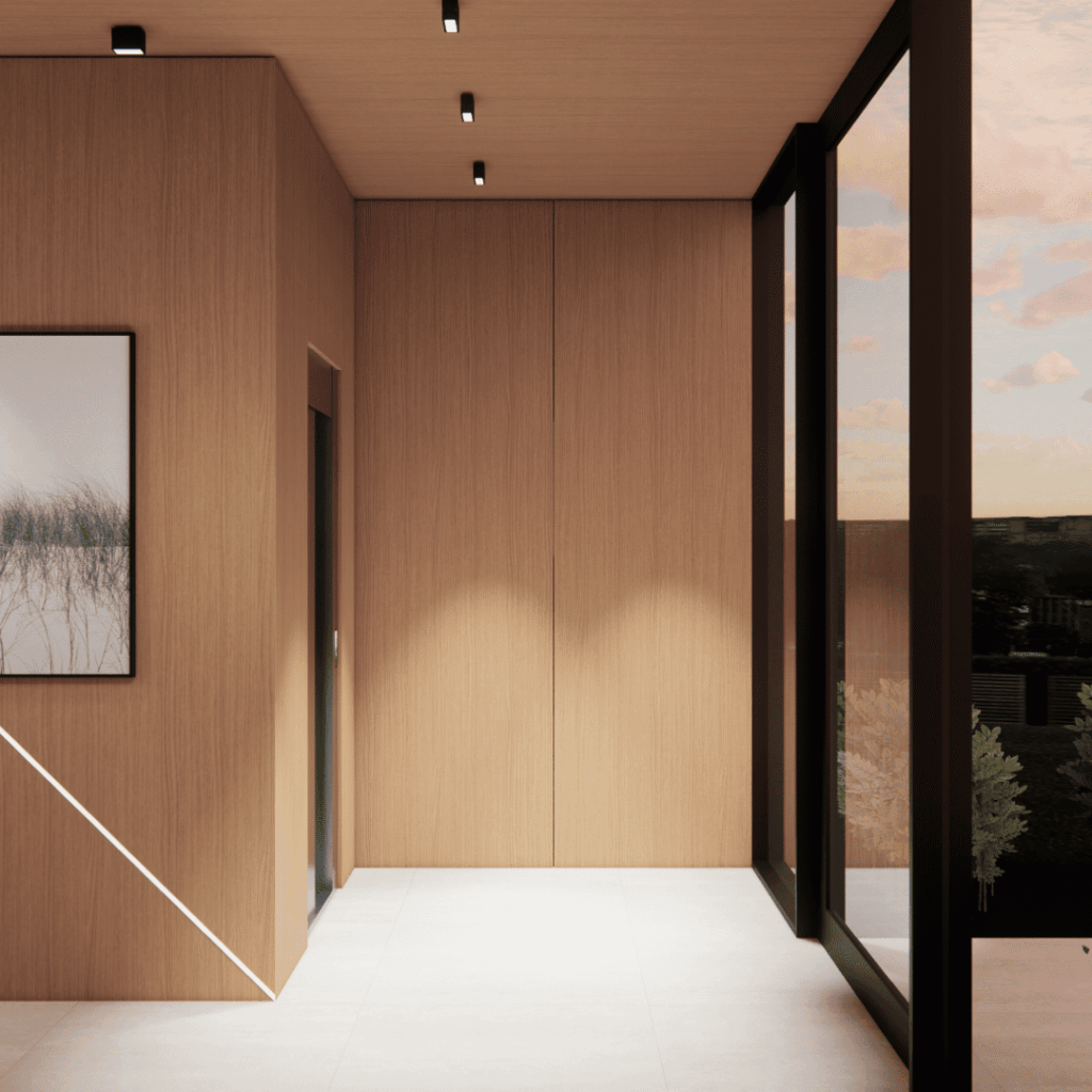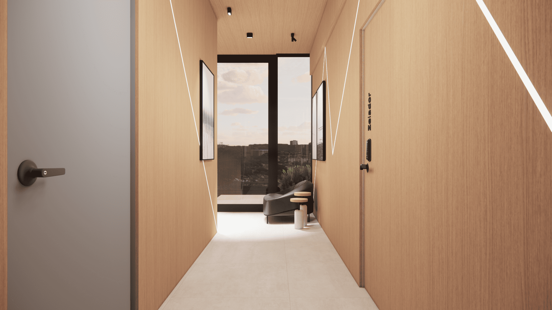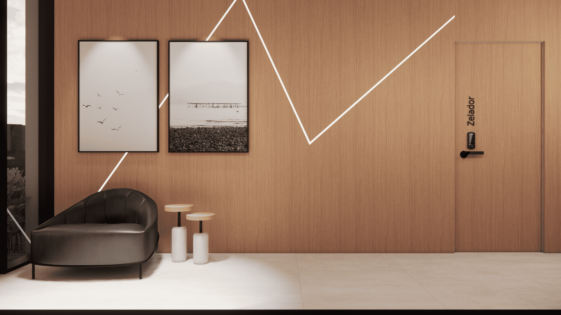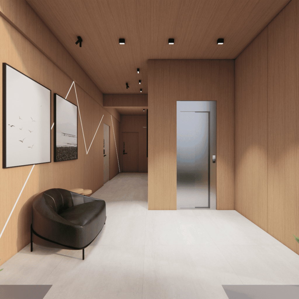 Hall de entrada contemporâneo com revestimento amadeirado, iluminação linear embutida e poltrona preta em destaque, transmitindo sofisticação e acolhimento.