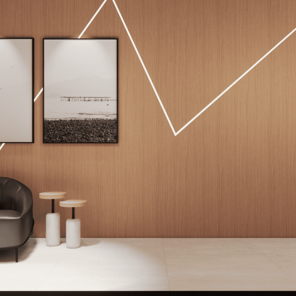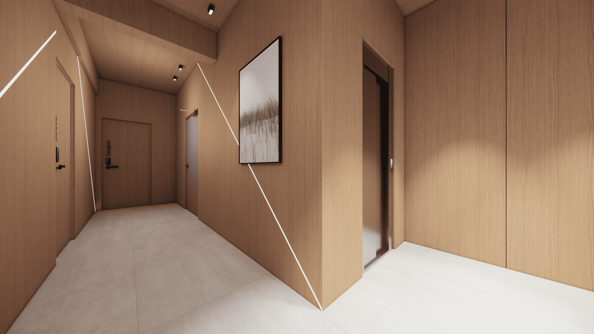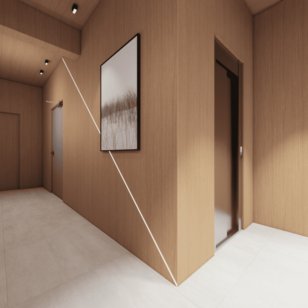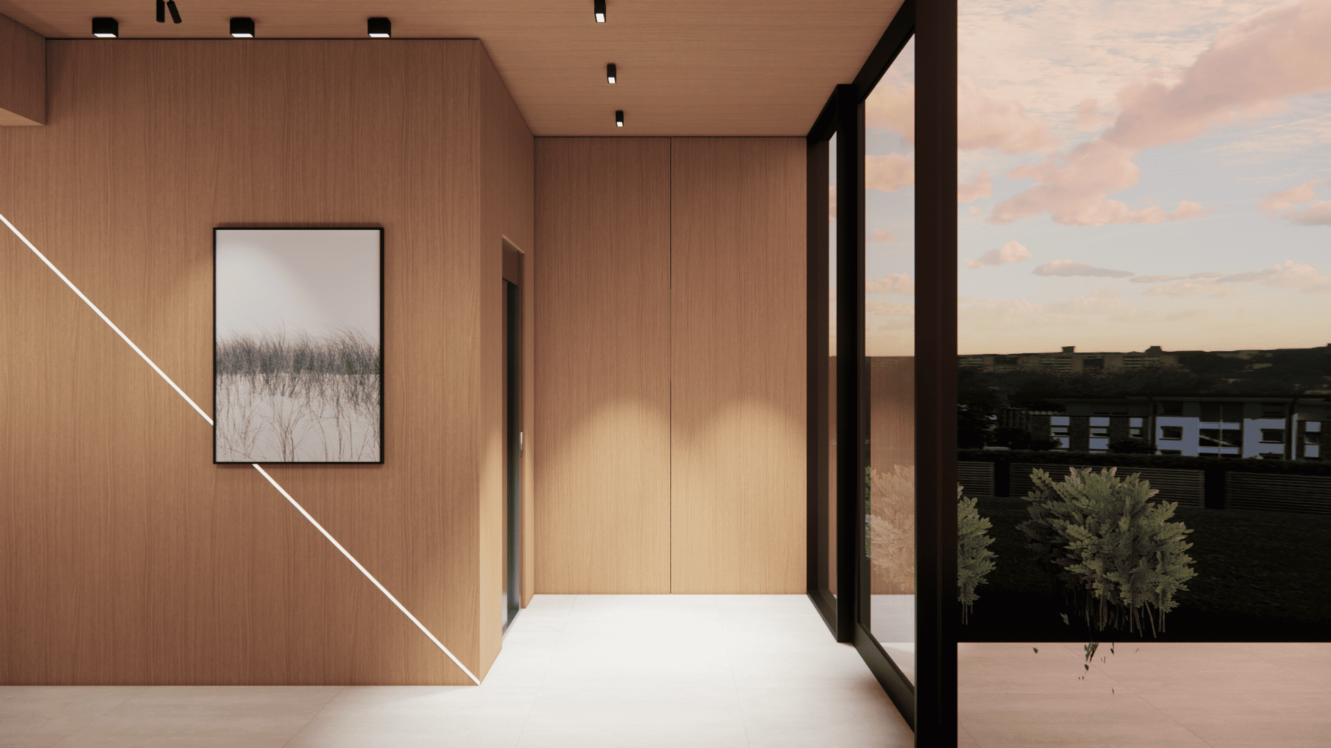 Hall de entrada contemporâneo com revestimento amadeirado, iluminação linear embutida e poltrona preta em destaque, transmitindo sofisticação e acolhimento.