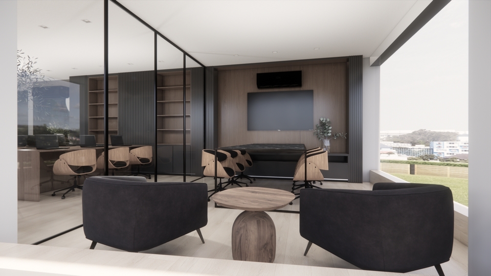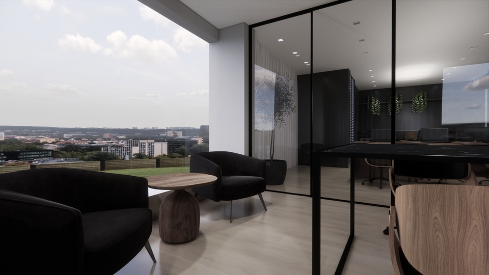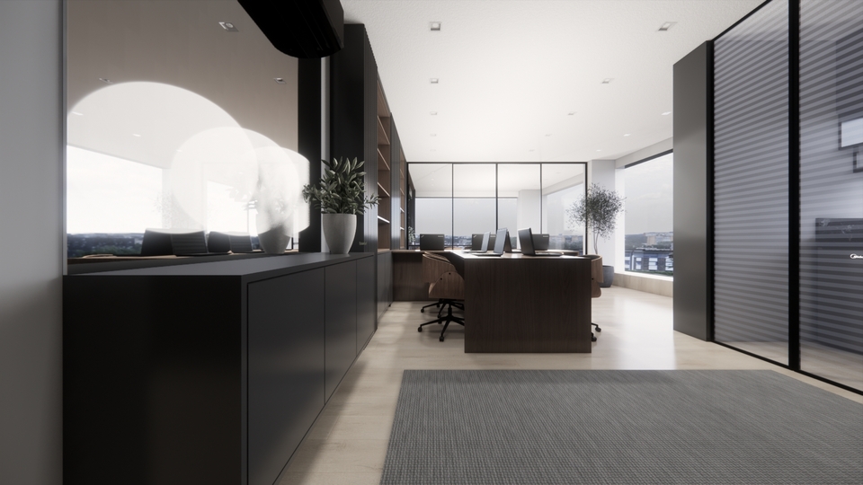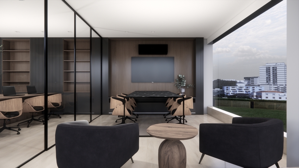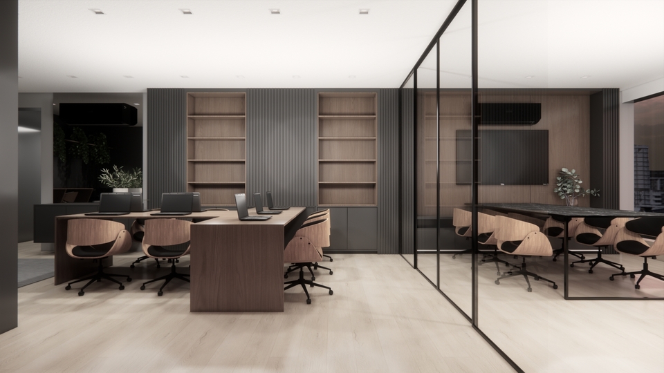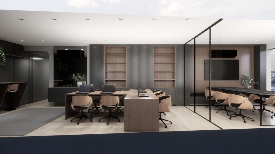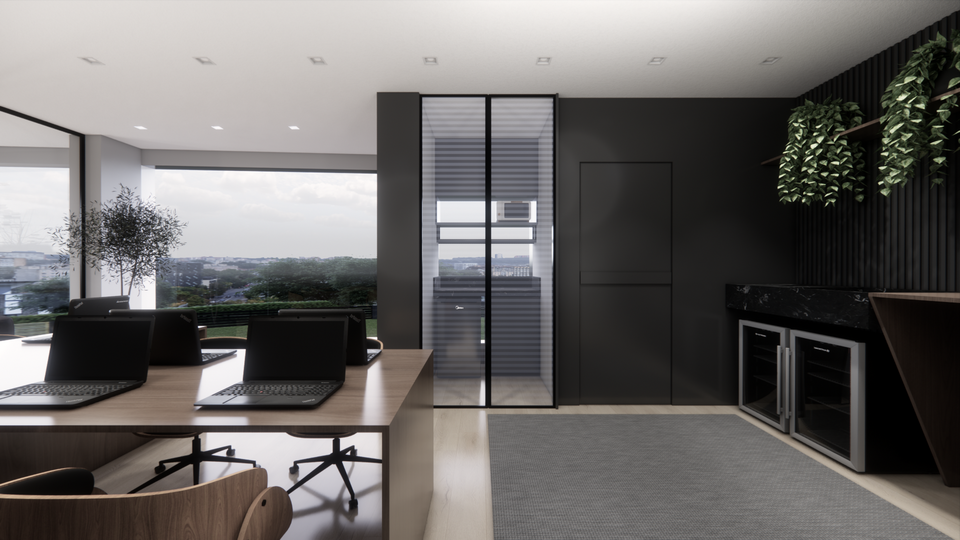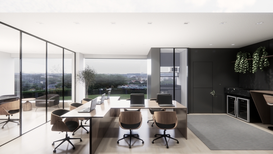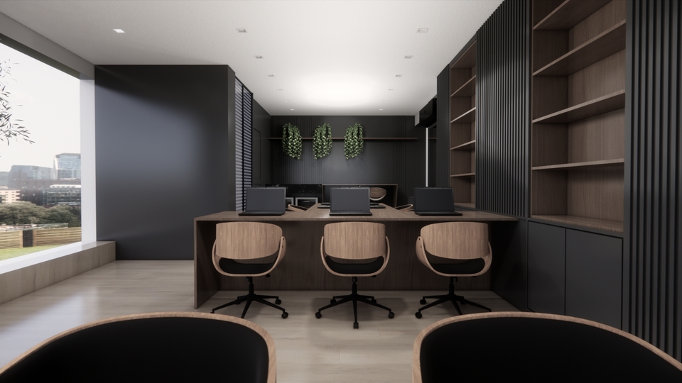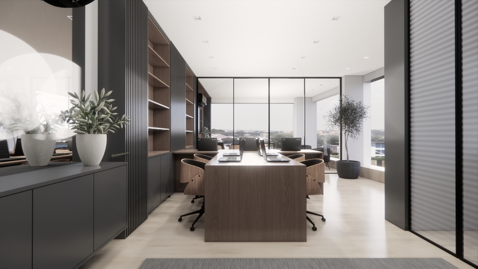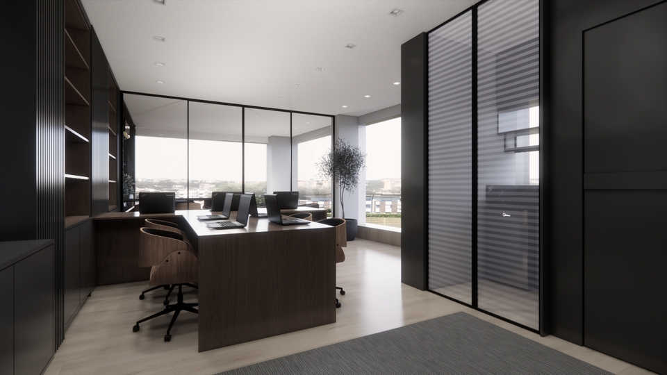 Escritório contemporâneo com layout integrado e atmosfera elegante. O projeto valoriza a iluminação natural e a vista externa, combinando madeira, preto fosco e vidro para transmitir sofisticação e funcionalidade. O mobiliário de linhas retas e tons neutros, aliado a elementos verdes pontuais, reforça a sensação de equilíbrio e bem-estar no ambiente corporativo.