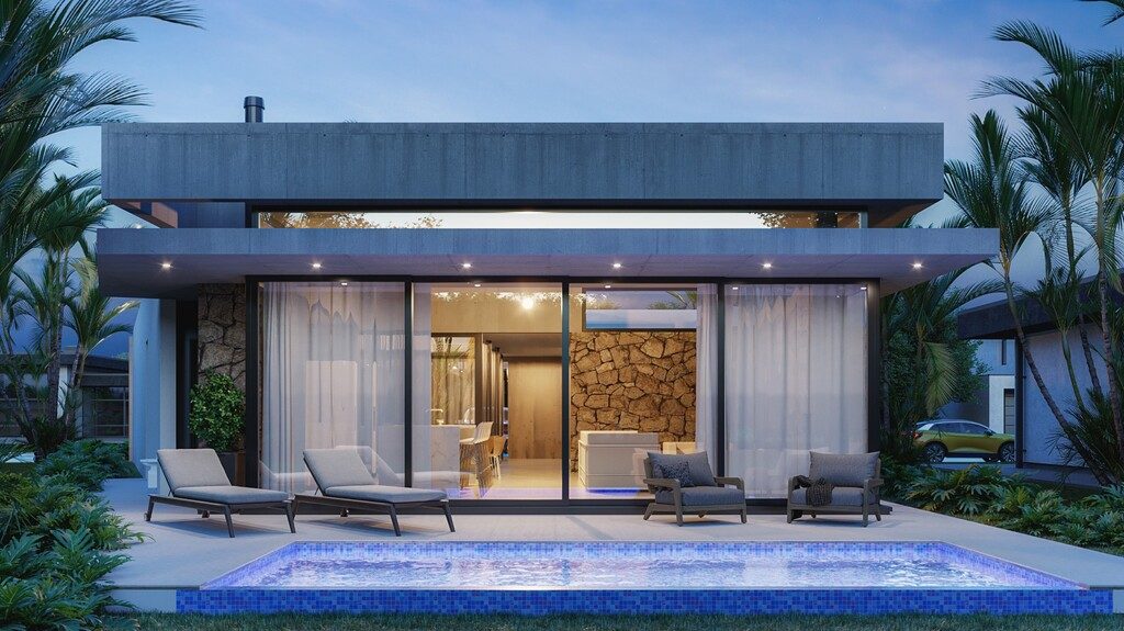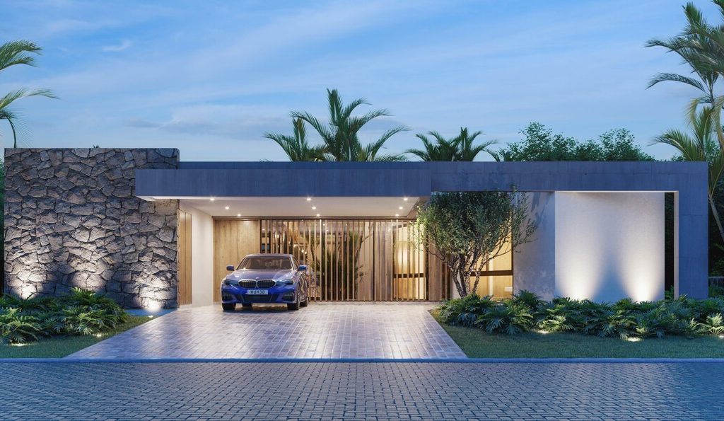 Residência térrea contemporânea com fachada marcada por volumes retos, painéis ripados e um elegante bloco de pedra natural. O projeto valoriza a integração com o paisagismo, iluminação cênica e grandes aberturas envidraçadas. Nos fundos, o living se abre para o lazer com piscina e área externa acolhedora, promovendo fluidez, bem-estar e conexão com a natureza.