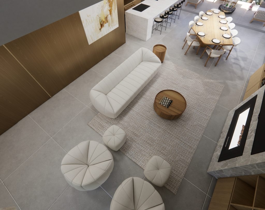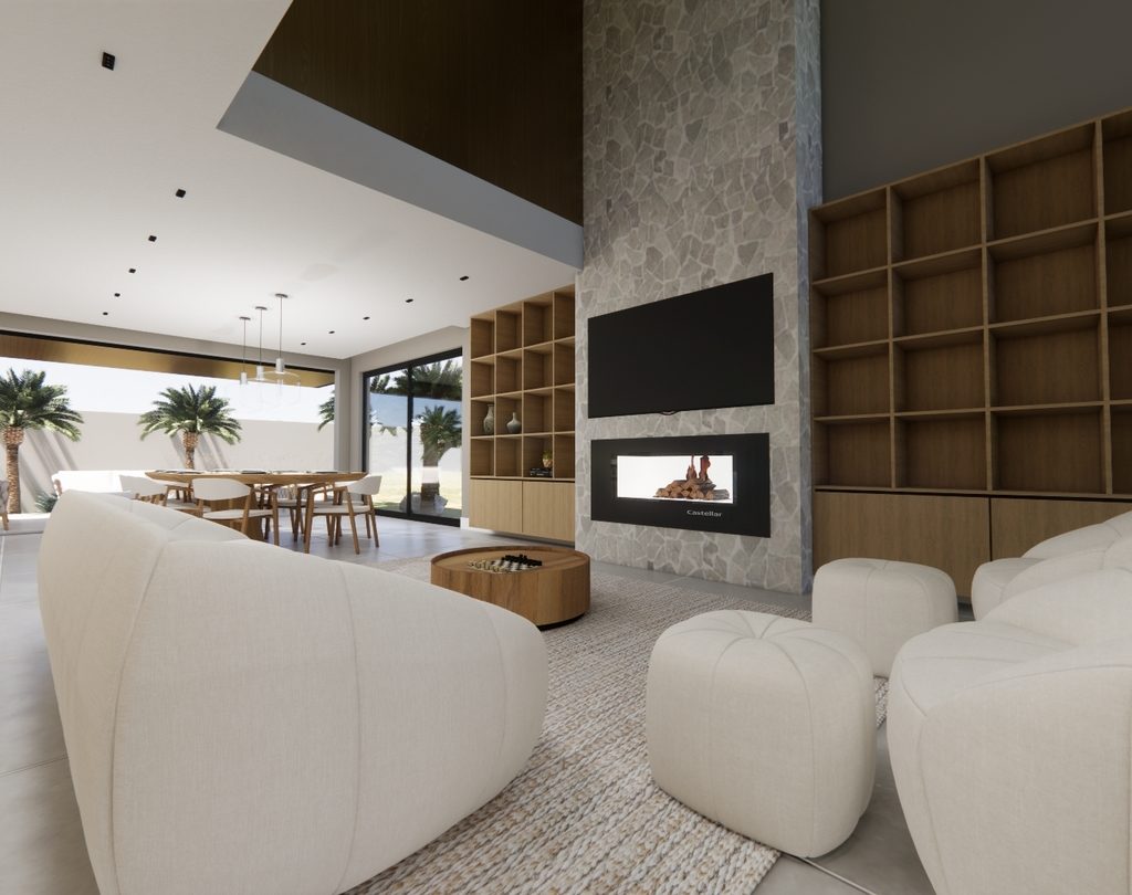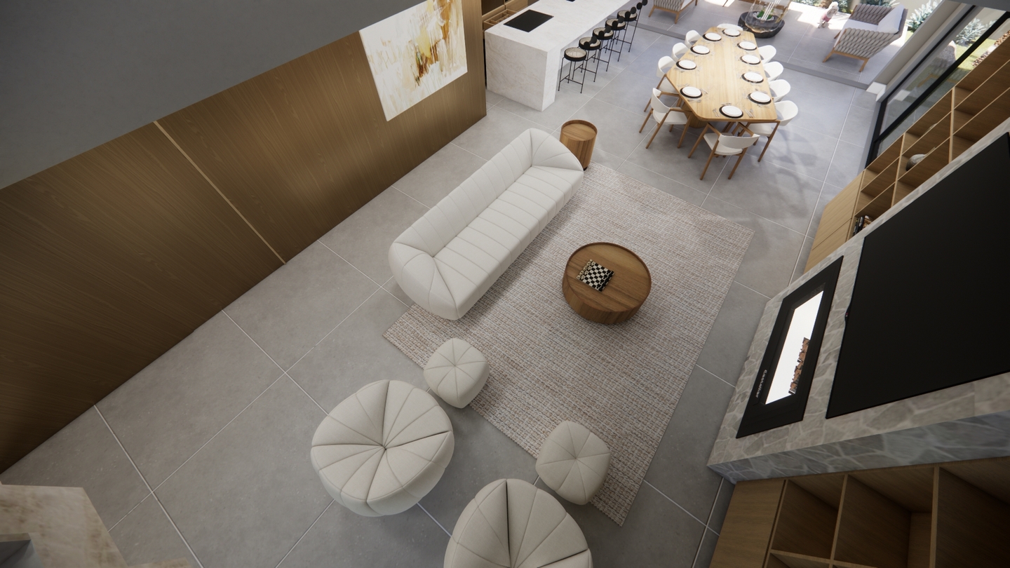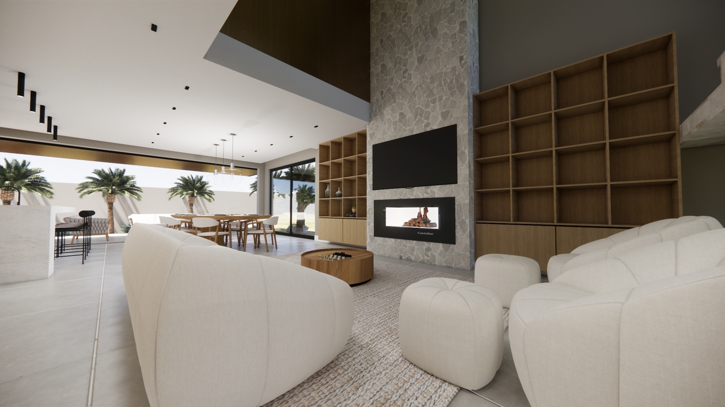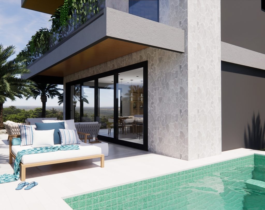 Residência contemporânea com volumes bem definidos e integração entre pedra, concreto e madeira. Grandes aberturas de vidro valorizam a iluminação natural e a conexão com o paisagismo tropical, criando uma fachada elegante e acolhedora com destaque para o terraço superior.