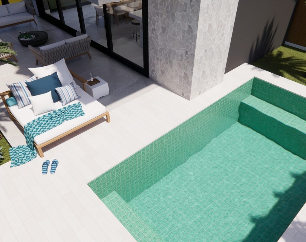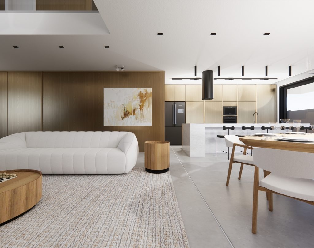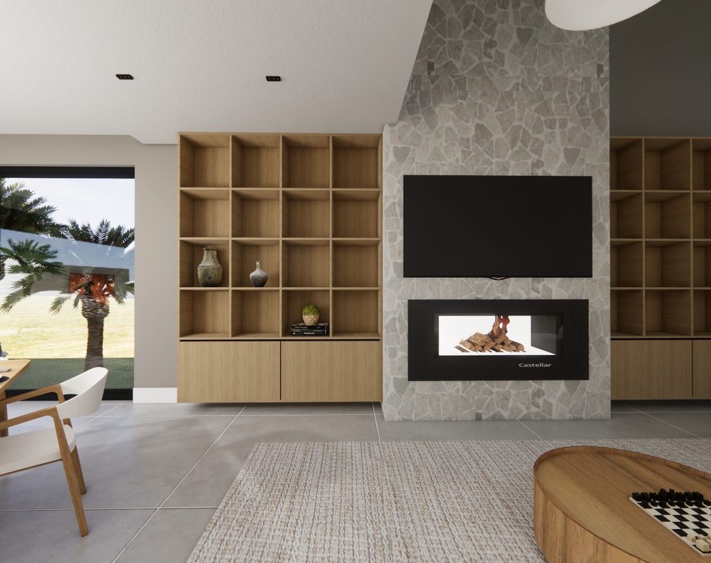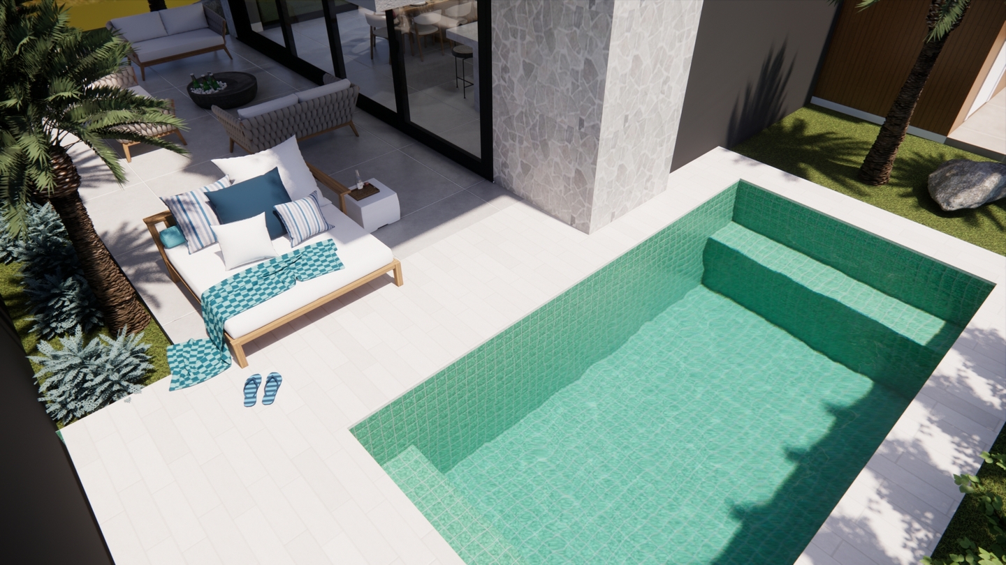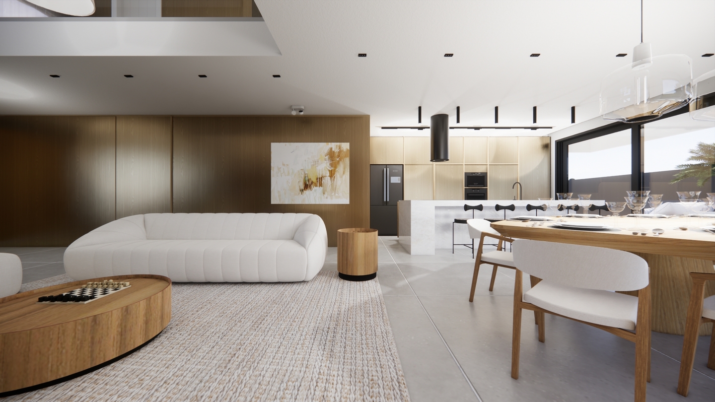 Residência contemporânea com volumes bem definidos e integração entre pedra, concreto e madeira. Grandes aberturas de vidro valorizam a iluminação natural e a conexão com o paisagismo tropical, criando uma fachada elegante e acolhedora com destaque para o terraço superior.
