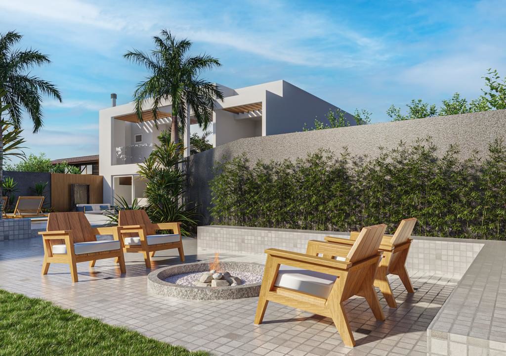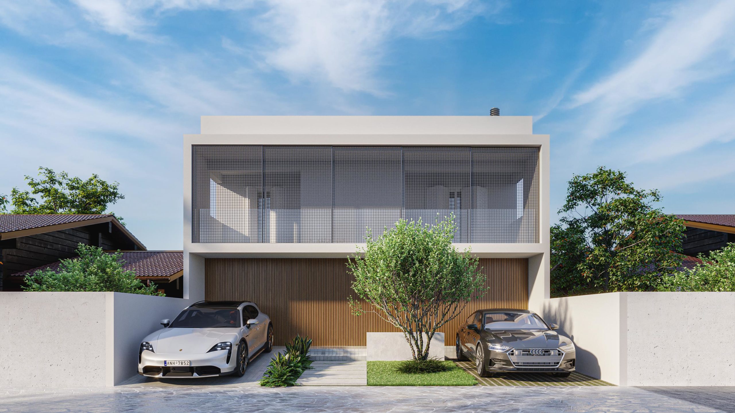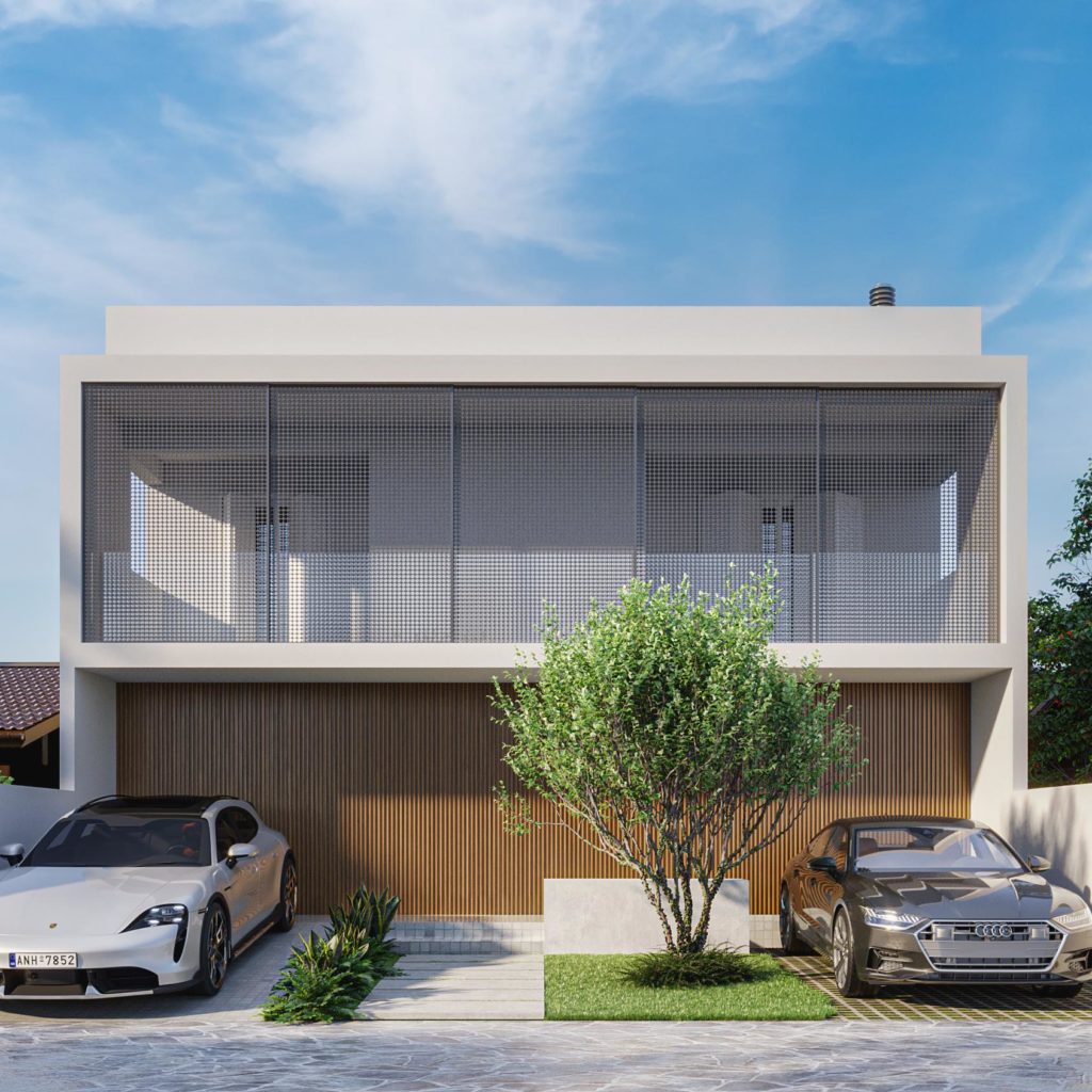 Residência contemporânea de linhas retas e fachada minimalista. O uso de brises metálicos e revestimento em madeira natural cria equilíbrio entre privacidade e leveza, enquanto o paisagismo sutil e o pátio frontal valorizam a elegância e a simetria do projeto.