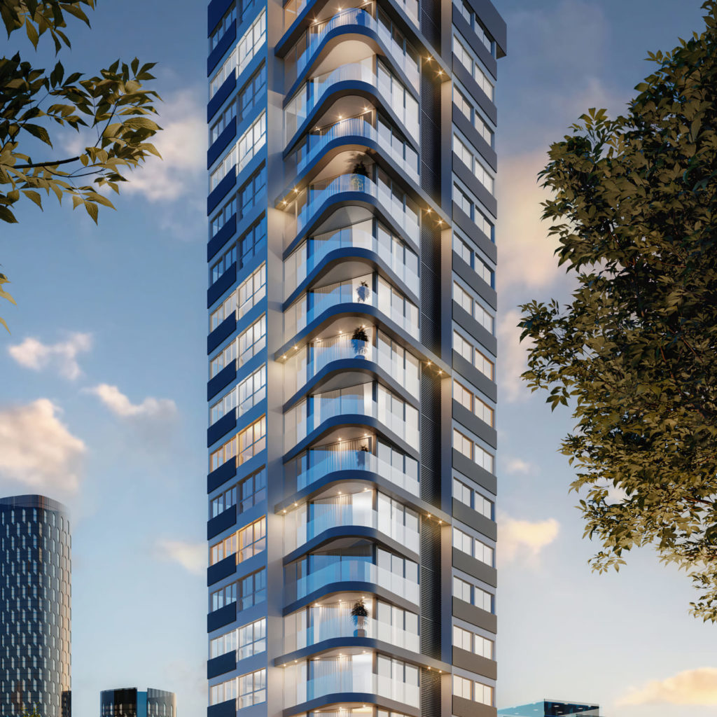 Inspirado na elegância atemporal dos primeiros arranha-céus de Nova York, o Residencial Taos explora formas curvas e cantos arredondados que conferem leveza e dinamismo à volumetria vertical. A fachada é marcada por amplas superfícies envidraçadas e linhas contínuas que reforçam a verticalidade e garantem vistas privilegiadas. O projeto revisita o caráter icônico do Flatiron Building, reinterpretando-o com uma linguagem contemporânea e sofisticada.